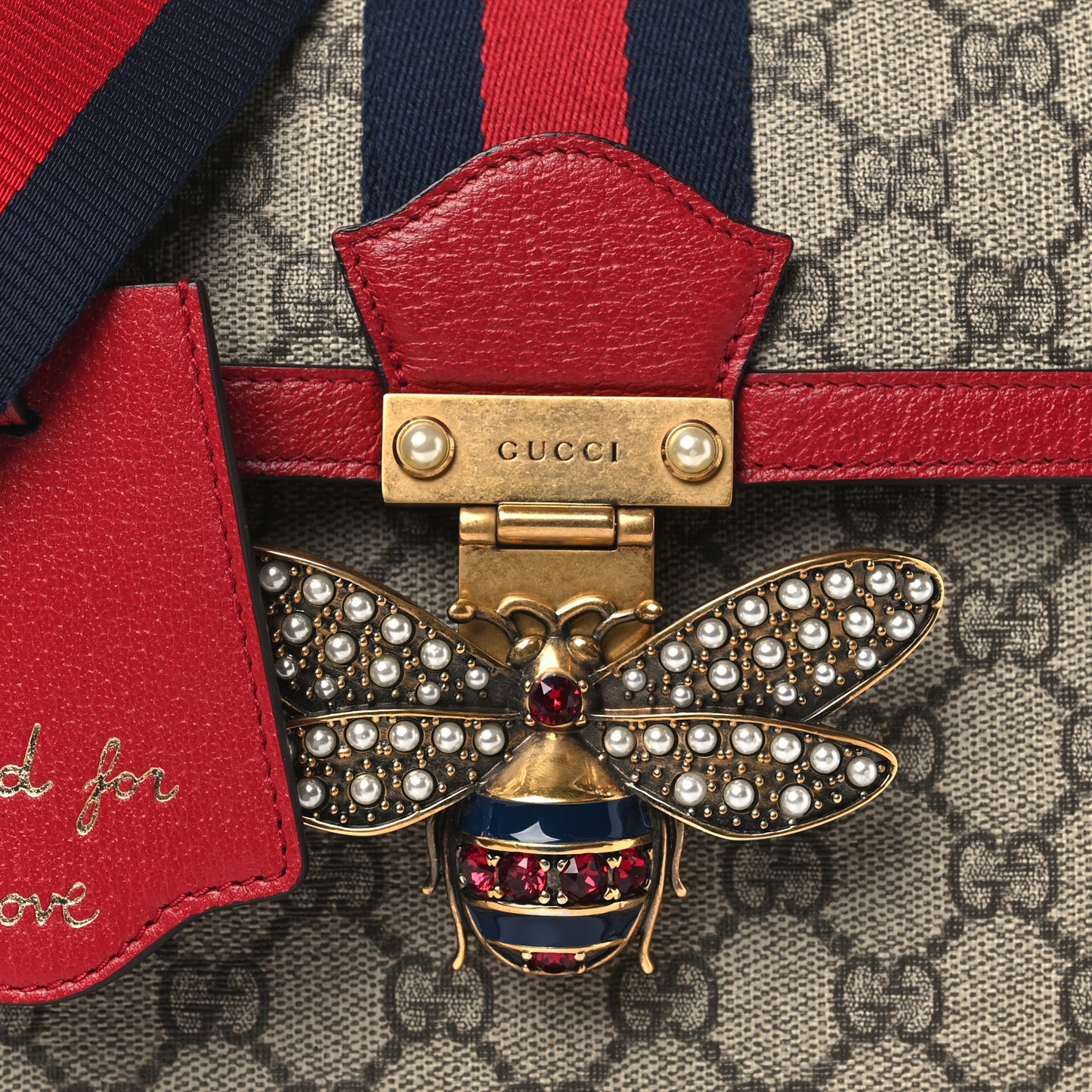 This is an authentic GUCCI GG Supreme Monogram Small Queen Margaret Top Handle Bag in Red. This stylish bag is crafted of Gucci GG supreme monogram coated canvas, with red calfskin leather trim. The bag features a rolled leather top handle, and an aged gold jewel and pearl-encrusted bee motif on the crossover flap. The bag opens with a press-lock to a partitioned beige microfiber interior with zipper and patch pockets.Follow this item for alerts. Gucci is a registered trademark of Gucci. FASHIONPHILE is not affiliated with Gucci.