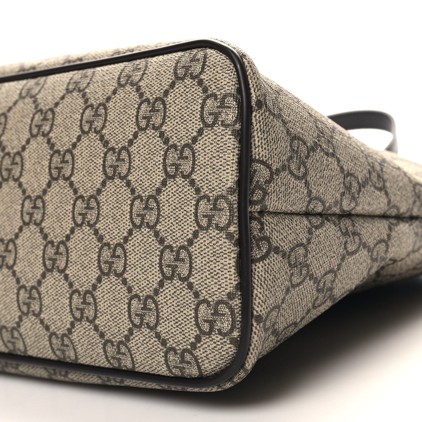 This is an authentic GUCCI GG Supreme Monogram Small Zippered Tote in Dark Brown. This stylish tote is crafted of GG Supreme Monogram canvas with dark brown leather trim, leather strap top handles, silver hardware, and an optional adjustable leather shoulder strap. The top zipper opens to a brown fabric interior with a zipper and patch pocket.Follow this item for alerts. Gucci is a registered trademark of Gucci. FASHIONPHILE is not affiliated with Gucci.