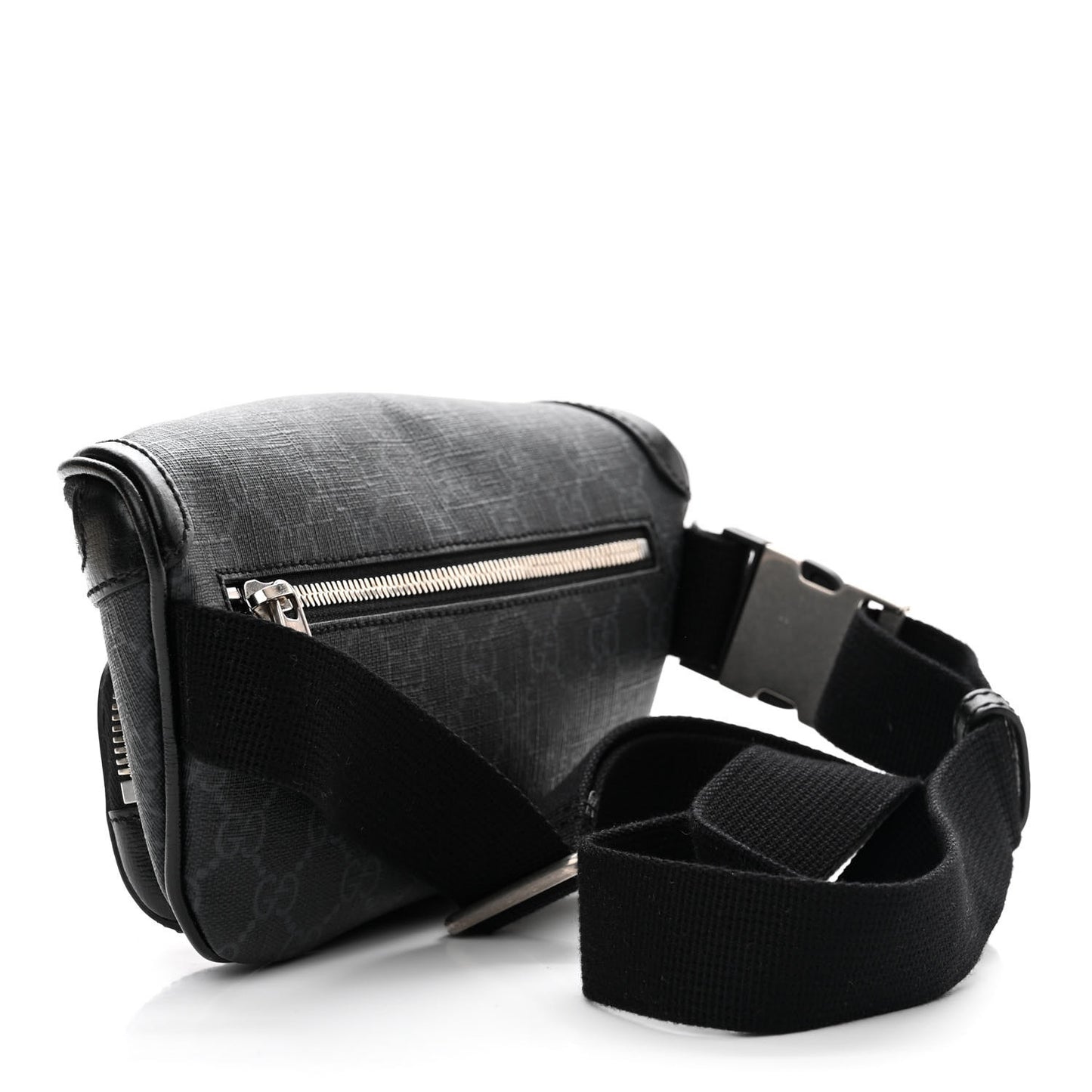 This is an authentic GUCCI GG Supreme Monogram Textured Calfskin Retro Interlocking G Belt Bag in Black. This chic belt bag is finely crafted of coated black Gucci GG monogram canvas. The bag features a front zipper pocket and an adjustable black canvas belt strap with silver hardware. The top zipper opens to a black fabric interior.Follow this item for alerts. Gucci is a registered trademark of Gucci. FASHIONPHILE is not affiliated with Gucci.