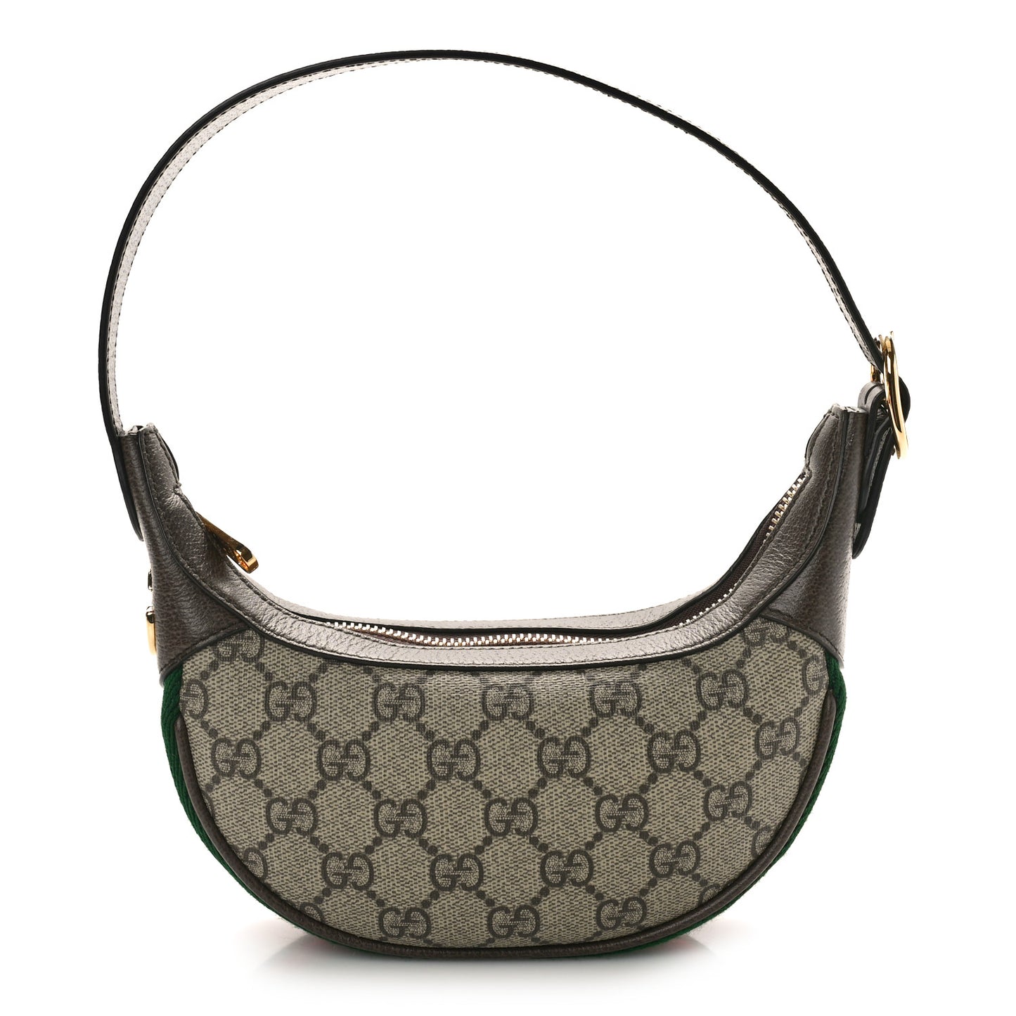 This is an authentic GUCCI GG Supreme Monogram Textured Calfskin Web Mini Ophidia Half Moon Hobo in Beige, Ebony, and New Acero. This Gucci shoulder bag is beautifully crafted of brown on beige Gucci GG supreme coated canvas. The bag features an aged gold double G logo, a signature red and green web stripe with an adjustable brown leather shoulder strap. The top zipper opens to a beige fabric interior with a card slots.Follow this item for alerts. Gucci is a registered trademark of Gucci. FASHIONPHILE is not affiliated with Gucci.