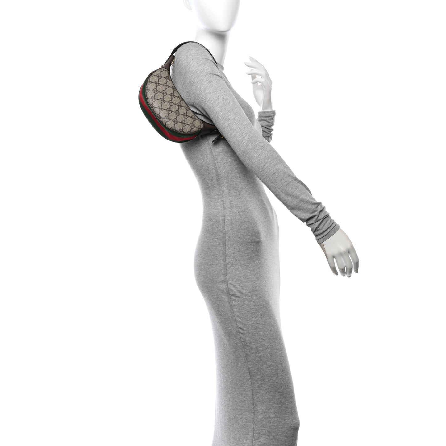 This is an authentic GUCCI GG Supreme Monogram Textured Calfskin Web Mini Ophidia Half Moon Hobo in Beige, Ebony, and New Acero. This Gucci shoulder bag is beautifully crafted of brown on beige Gucci GG supreme coated canvas. The bag features a gold double G logo, a signature red and green web stripe with an adjustable brown leather shoulder strap. The top zipper opens to a beige microfiber interior with a card slots and a brass key ring.Follow this item for alerts. Gucci is a registered trademark of Gucci. FASHIONPHILE is not affiliated with Gucci.