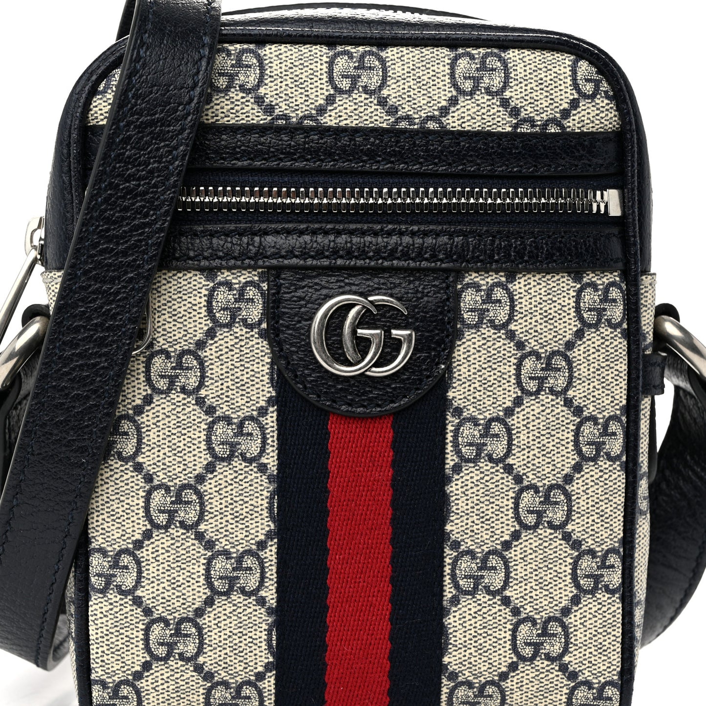 This is an authentic GUCCI GG Supreme Monogram Textured Calfskin Web Mini Ophidia Messenger in Beige and Blue. This camera-style crossbody bag is crafted of Gucci GG supreme monogram coated canvas, with navy leather trim. The bag features a front zipper pocket with blue and red web stripe design and an adjustable shoulder strap with silver hardware. The top zipper opens to a beige fabric interior.Follow this item for alerts. Gucci is a registered trademark of Gucci. FASHIONPHILE is not affiliated with Gucci.