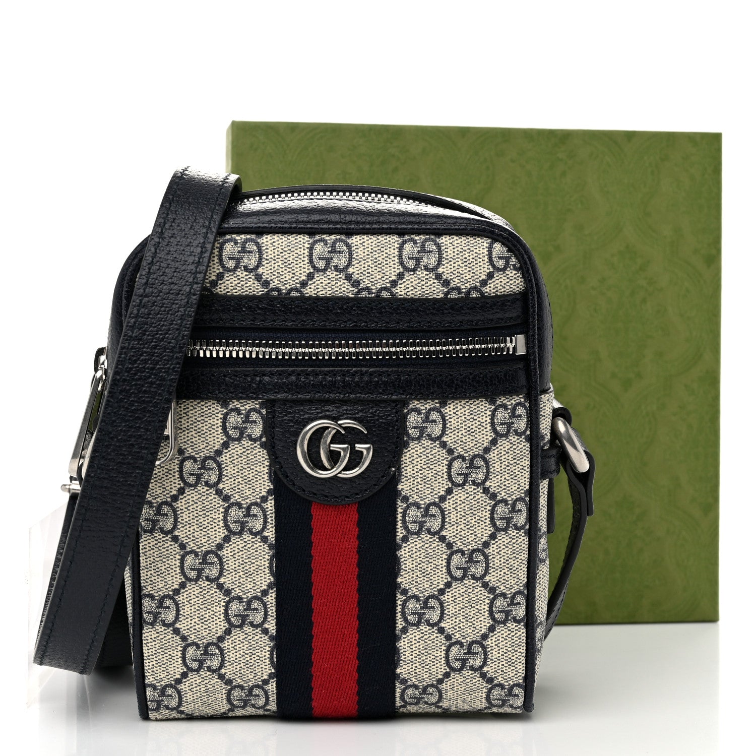 Gucci/ Bags/ Shoulder Bags /Gucci GG Supreme Monogram Textured Calfskin Web Mini Ophidia Messenger Beige Blue