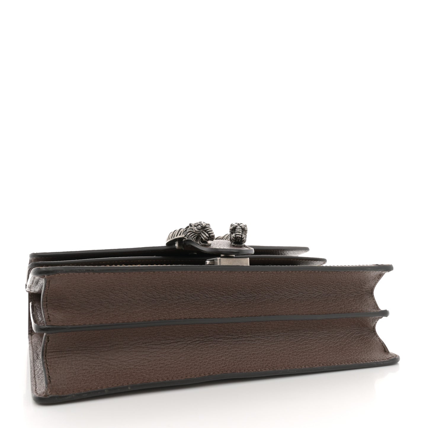 This is an authentic GUCCI GG Supreme Monogram Textured Dollar Calfskin Top Handle Dionysus Shoulder Bag in Beige, Ebony, and New Acero. This bag is crafted of Gucci GG monogram canvas and brown leather trim. The bag features a aged silver chain shoulder strap, a textured horseshoe closure with tiger heads at the end and matching leather top handle. The press lock closure opens to a beige suede lining, zipper compartment, and front flap.Follow this item for alerts. Gucci is a registered trademark of Gucci. FASHIONPHILE is not affiliated with Gucci.