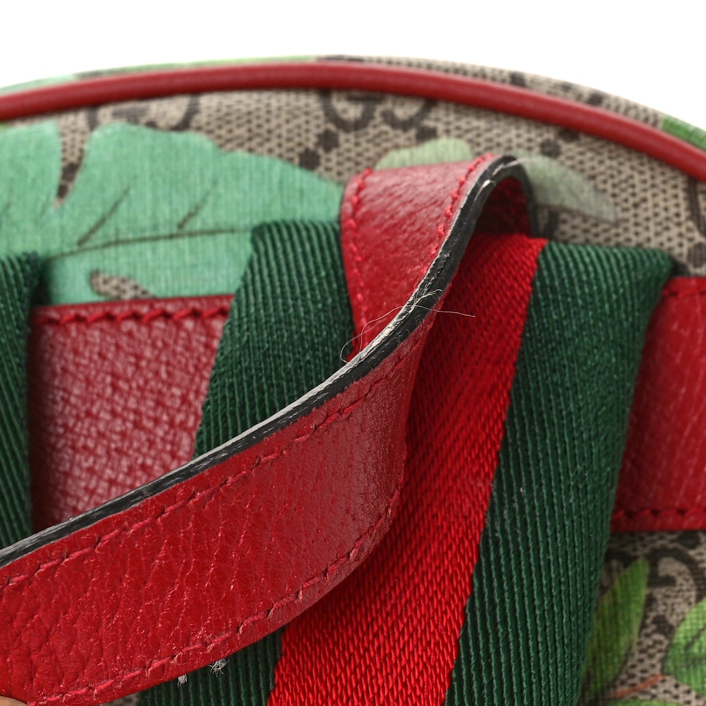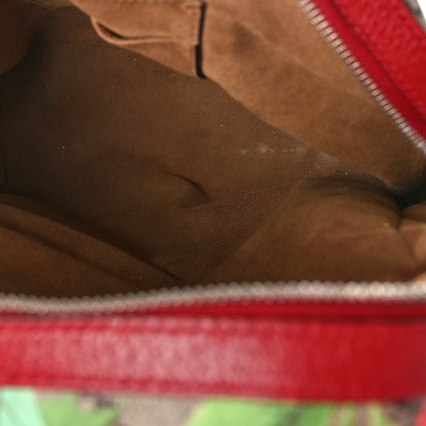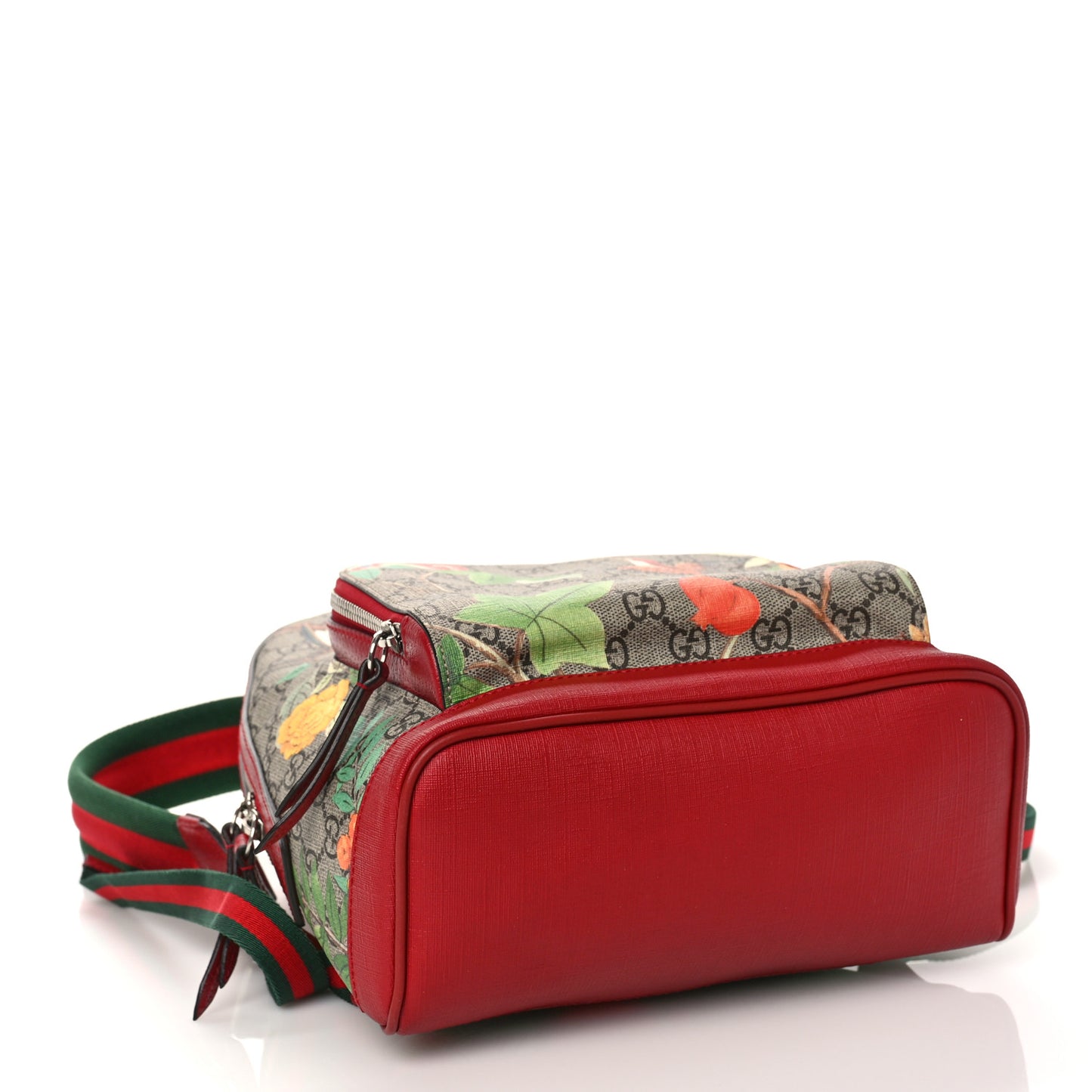 This is an authentic GUCCI GG Supreme Monogram Tian Web Small Day Backpack in Beige, Multicolor and Red. This stylish backpack is crafted with Gucci GG monogram coated canvas with a floral and hummingbird print overlay. The bag features a front zipper pocket, red leather trim, a top handle, and adjustable red and green web stripe nylon shoulder straps with aged silver hardware. The wrap-around zippers open to a spacious brown microfiber interior with zipper and patch pockets.Follow this item for alerts. Gucci is a registered trademark of Gucci. FASHIONPHILE is not affiliated with Gucci.