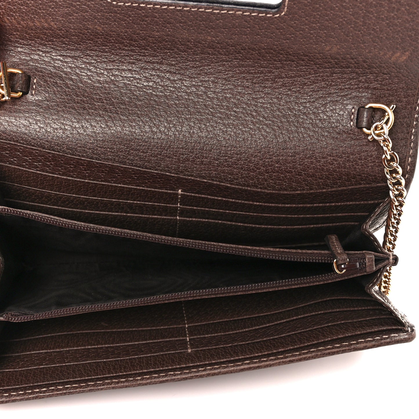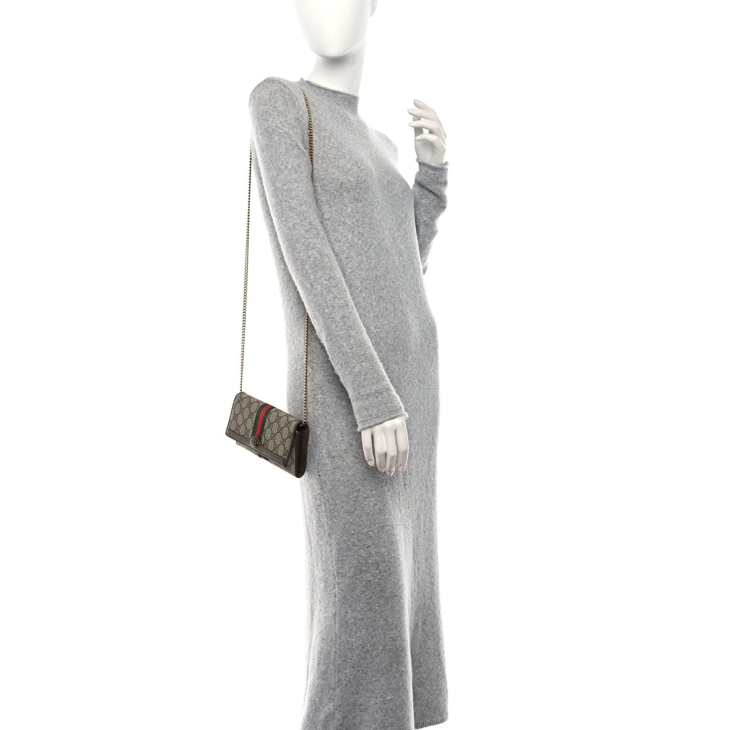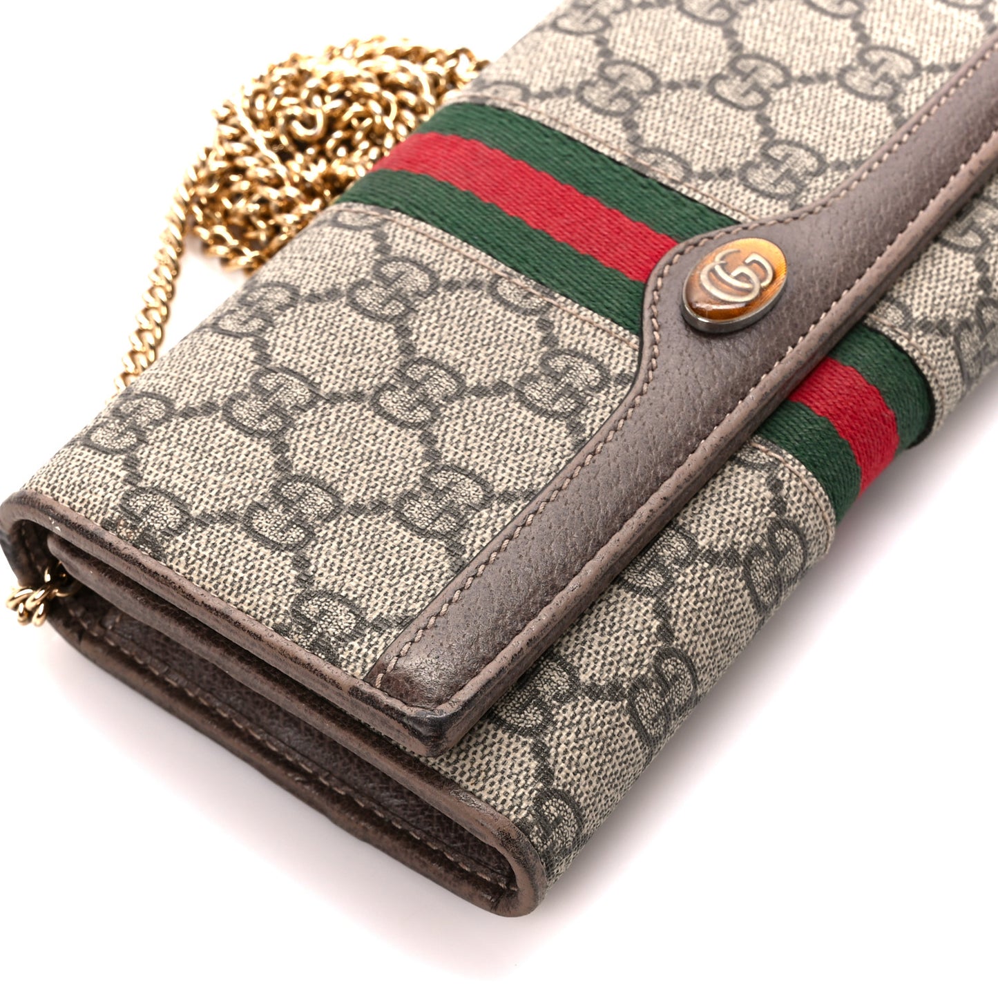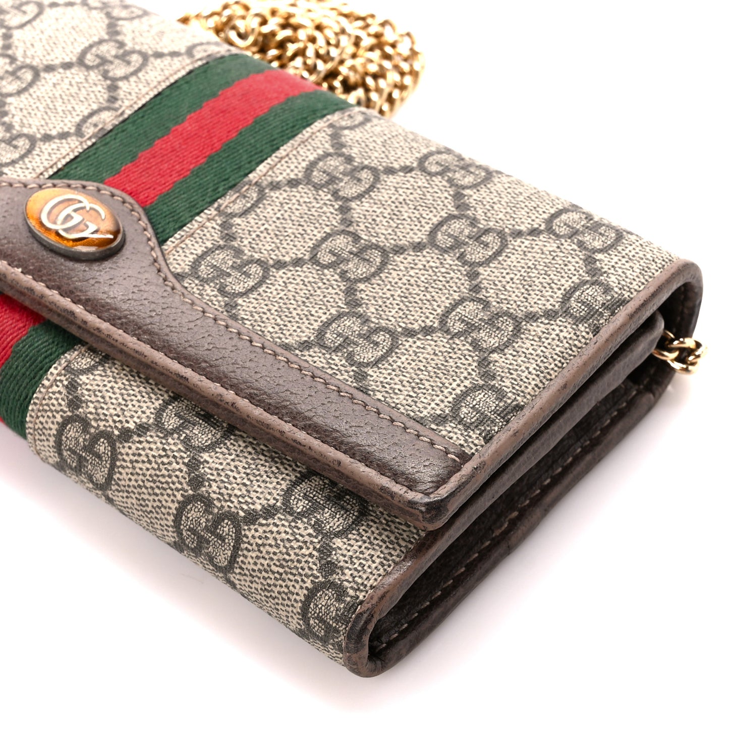 This is an authentic GUCCI GG Supreme Monogram Web Ophidia Wallet On Chain in Brown. This wallet is crafted of Gucci GG monogram coated canvas with a green and red web stripe and brown leather trim. This wallet features a snap button closure in gold and an optional gold chain shoulder strap. The flap opens to a partitioned brown leather interior with card slots, a zipper compartment, and patch pockets.Follow this item for alerts. Gucci is a registered trademark of Gucci. FASHIONPHILE is not affiliated with Gucci.