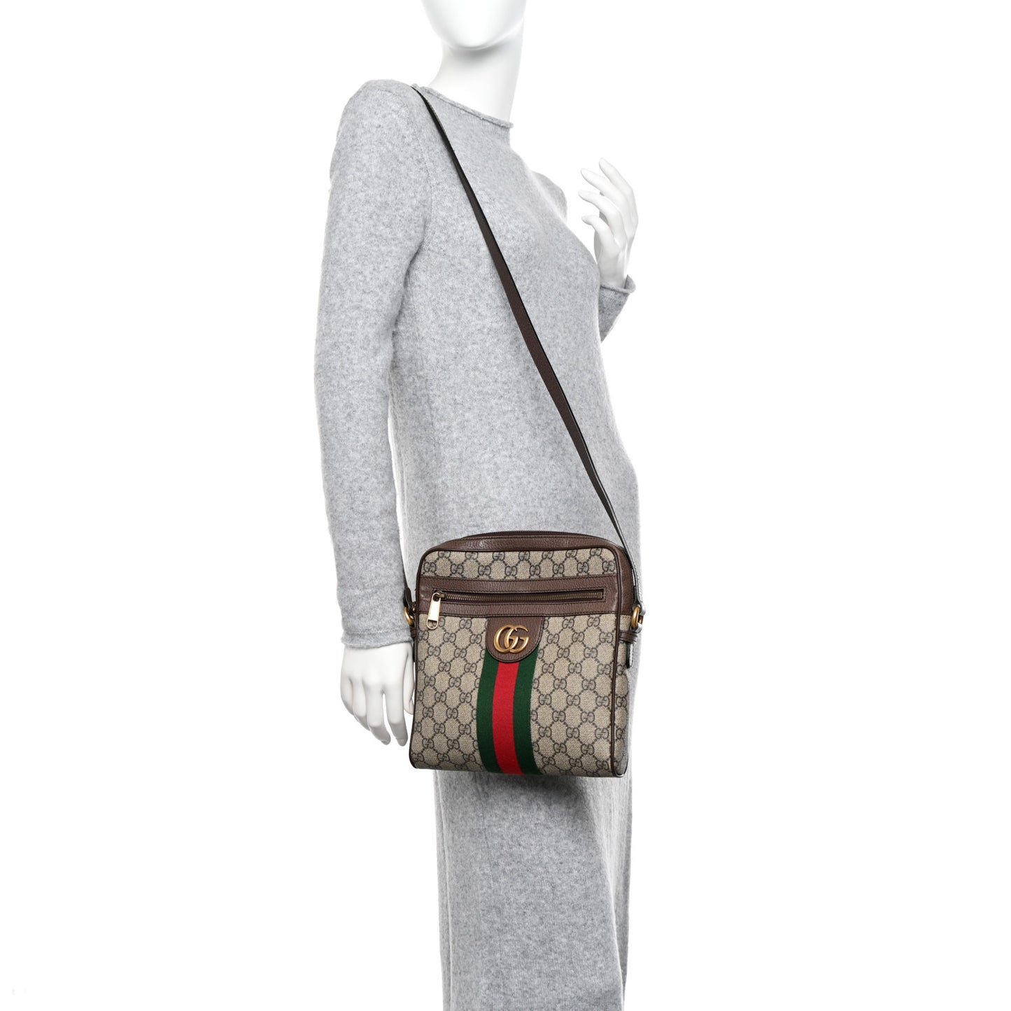 This is the authentic GUCCI GG Supreme Monogram Web Small Ophidia Messenger Bag in Brown. This camera-style crossbody bag is crafted of monogram coated canvas with brown leather trim. The bag features a brown leather adjustable shoulder strap, a front zipper pocket with the signature green and red web, and aged gold hardware. This opens to a natural fabric interior with a zipper pocket.Follow this item for alerts. Gucci is a registered trademark of Gucci. FASHIONPHILE is not affiliated with Gucci.