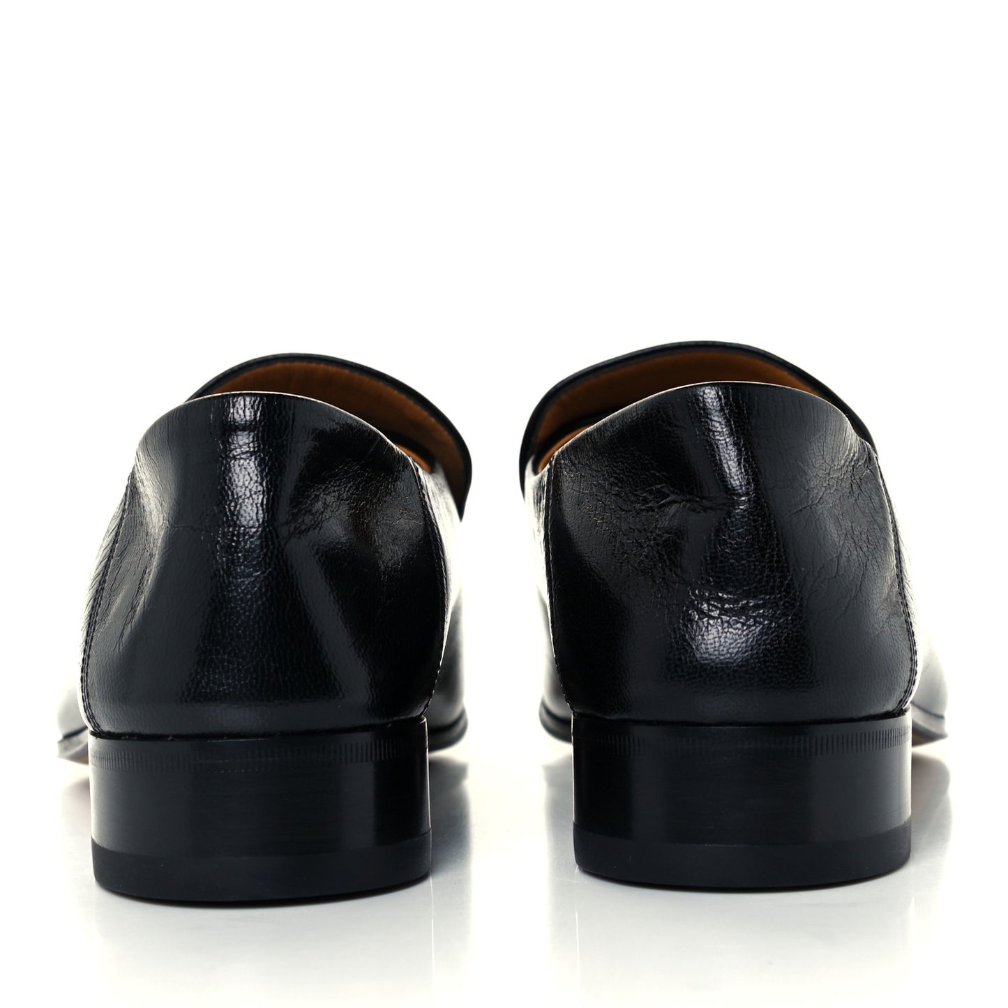 This is an authentic pair of GGUCCI Goatskin Mens Horsebit Loafers size 8.5 in Black. These chic loafers are crafted of smooth black goatskin leather. They feature an aged gold horse-bit embellishment, a rounded toe, and a short wedge heel.Follow this item for alerts. Gucci is a registered trademark of Gucci. FASHIONPHILE is not affiliated with Gucci.