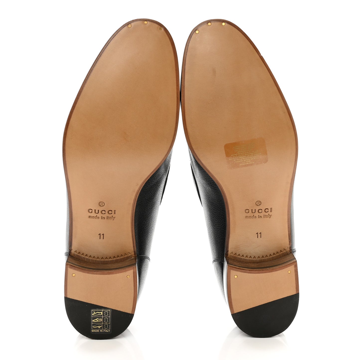 This is an authentic pair of GUCCI Goatskin Web Mens Horsebit Loafers size 11 in Black. These chic loafers are crafted of smooth black goatskin leather. They feature an aged gold horse-bit embellishment, a rounded toe, and a short wedge heel.Follow this item for alerts. Gucci is a registered trademark of Gucci. FASHIONPHILE is not affiliated with Gucci.