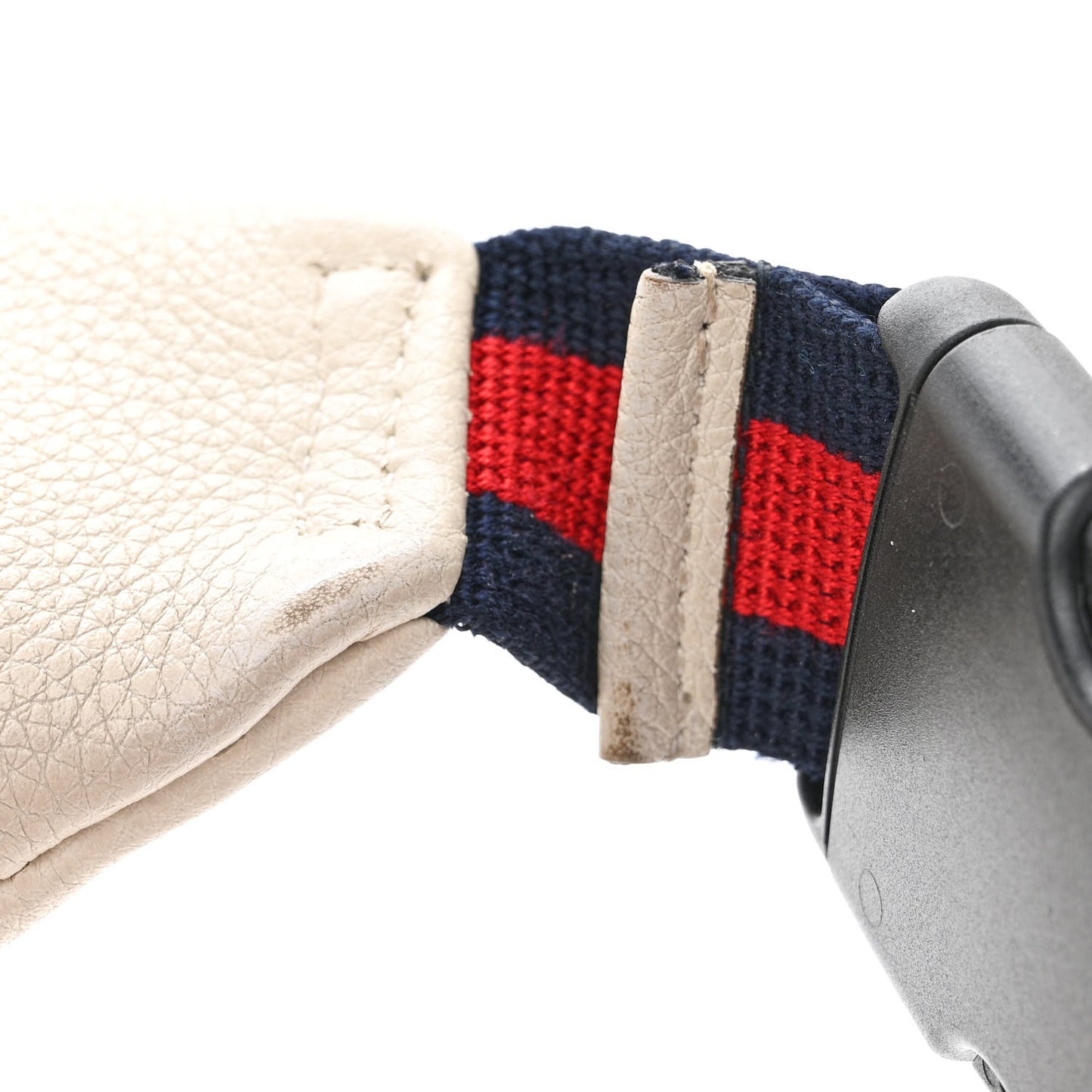 This is an authentic GUCCI Grained Calfskin Logo Belt Bag in White. This belt bag is white leather with a vintage Gucci logo. This bag has a nylon Gucci navy and red web belt and aged gold hardware. The front zipper opens to a beige natural fiber interior.