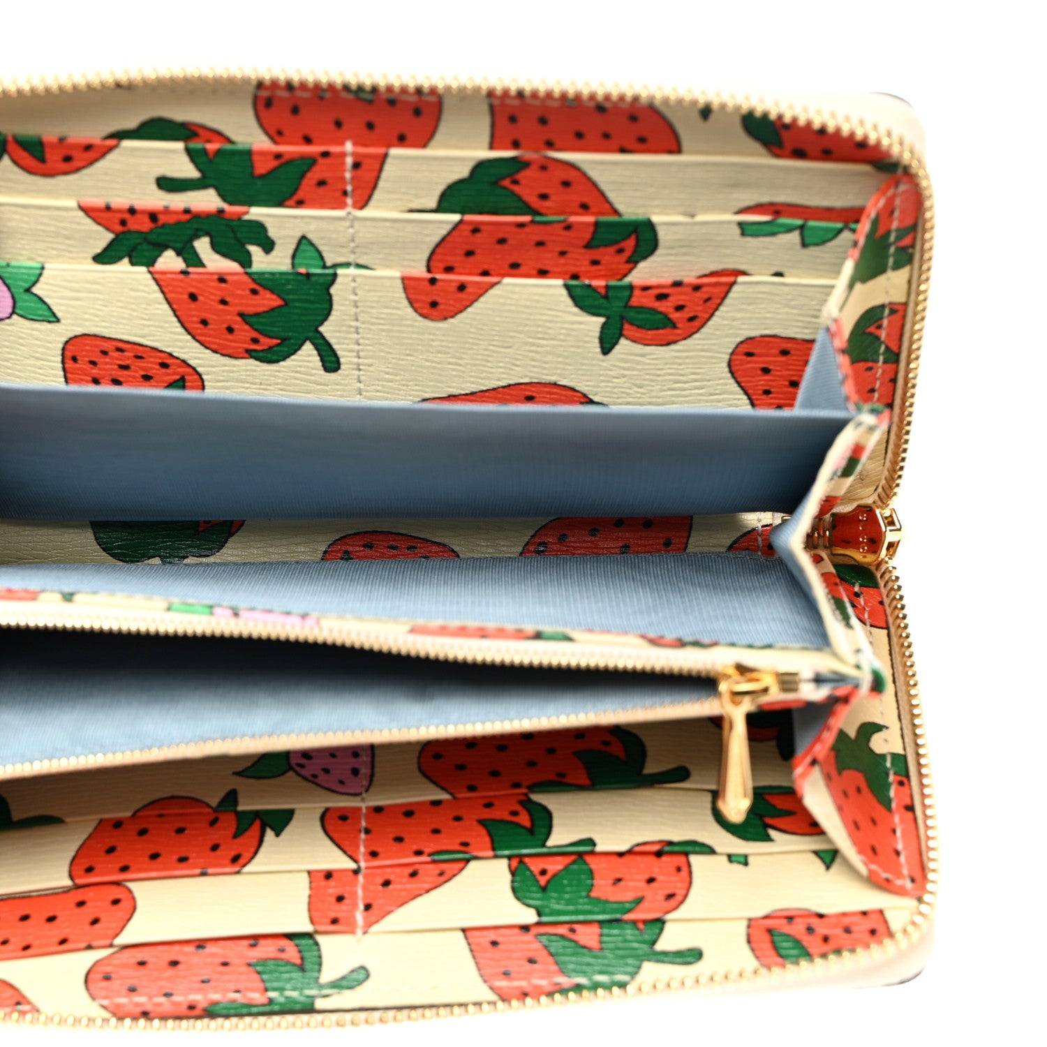 This is an authentic GUCCI Grainy Calfskin Strawberry Zumi Zip Around Wallet in Ivory and Red. This stylish wallet is crafted of ivory calfskin leather with a red and pink strawberry print. The wallet features a gold and silver interlocking GG horsebit logo and gold wrap-around zipper. The zipper opens to a partitioned blue fabric and matching leather patterned interior with card slots and a zipper compartment.Follow this item for alerts. Gucci is a registered trademark of Gucci. FASHIONPHILE is not affiliated with Gucci.