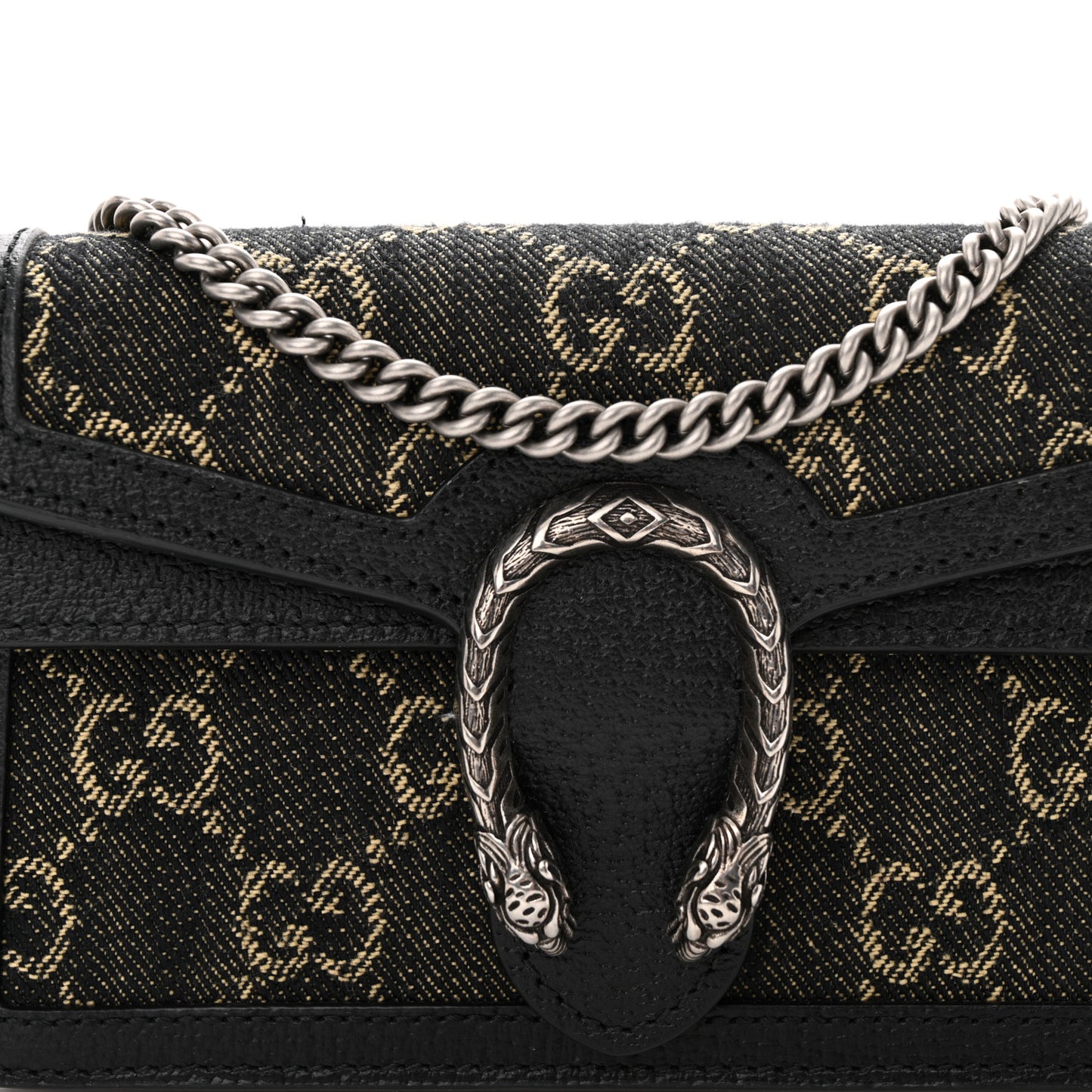 This is an authentic GUCCI Jacquard Black Denim GG Monogram Super Mini Dionysus Shoulder Bag in Black and Ivory. This petite bag is crafted of beige Gucci monogram on black denim canvas. This shoulder bag features a matte silver chain shoulder strap, black leather trim, and a textured silver horseshoe tiger spur closure. The flap opens to a black leather interior with a key ring.Follow this item for alerts. Gucci is a registered trademark of Gucci. FASHIONPHILE is not affiliated with Gucci.