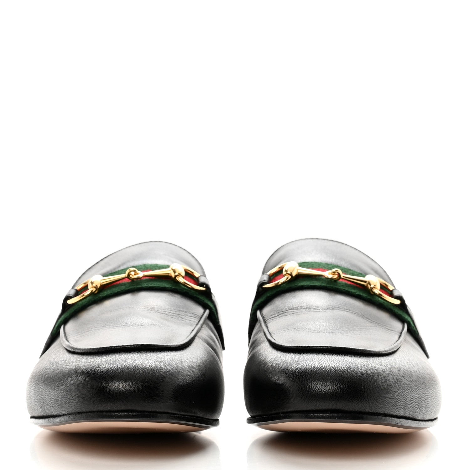 This is an authentic pair of GUCCI Malaga Kid Web Womens Princetown Slippers size 38 in Black. These stylish loafers are crafted of smooth black calfskin leather. They feature a gold horse-bit embellishment on the top, a rounded toe, and a 0.5-inch heel.Follow this item for alerts. Gucci is a registered trademark of Gucci. FASHIONPHILE is not affiliated with Gucci.