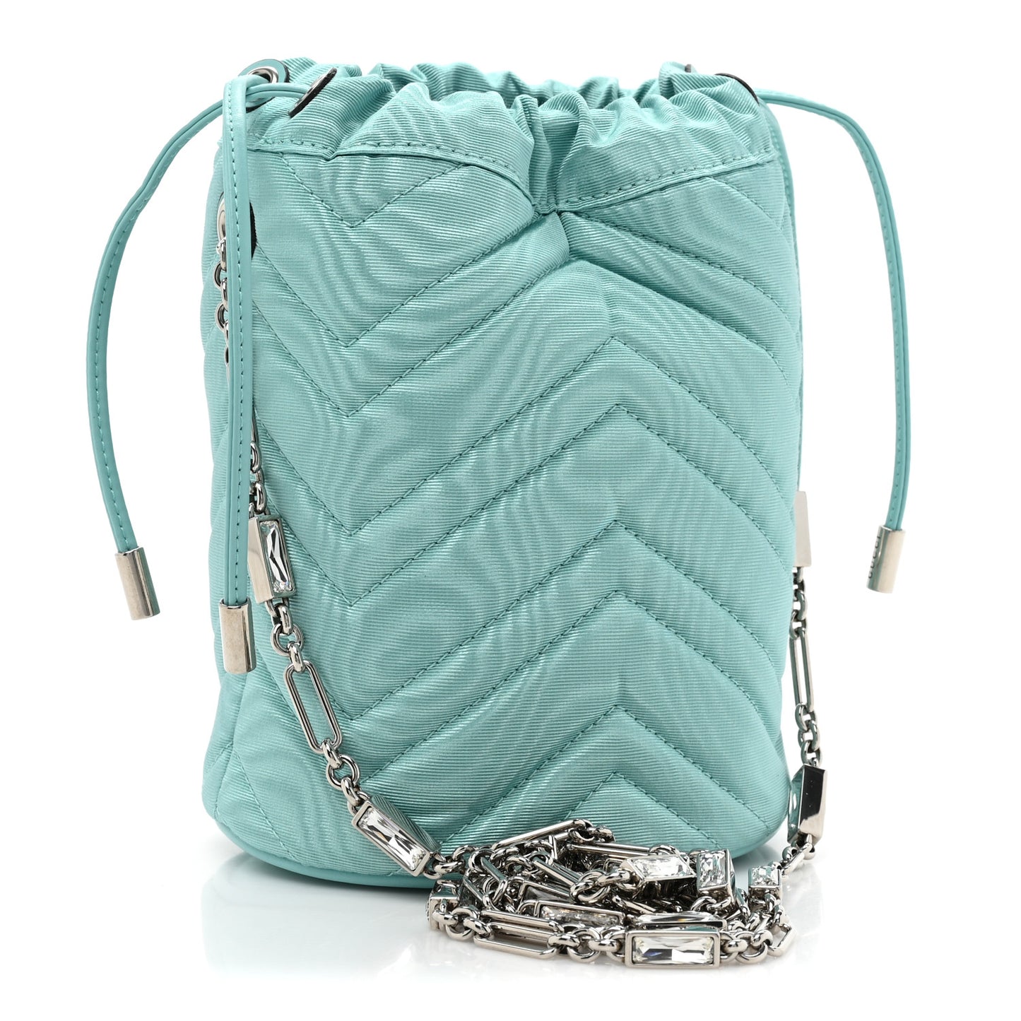 This is an authentic GUCCI Moire Fabric Calfskin Crystal Matelasse GG Marmont 2.0 Bucket Bag in Dark Ocean Wave and Crystal. This soft-structured bucket bag is crafted of light green silk fabric with a beautifully stitched chevron pattern and crystals. It features a silver chain shoulder strap, a top cinch cord, and a silver Gucci GG logo. This bag opens to a matching satinĀ interior with card slots and a removable key ring.Follow this item for alerts.Ā Gucci is a registered trademark of Gucci. FASHIONPHILE is not affiliated with Gucci.