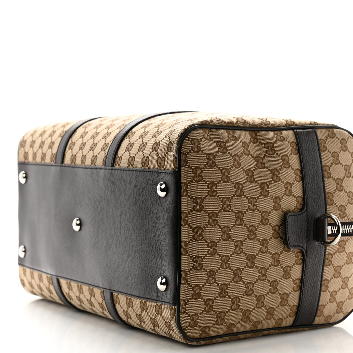 This is an authentic GUCCI Monogram Dollar Calfskin Boston Duffle Bag in Beige, Ebony, Testa di Moro, and Marrone Scuro. This stylish duffel is crafted of Gucci GG monogram canvas. It features dark brown leather top handles and an optional canvas shoulder strap with silver hardware. The top zipper opens to a spacious fabric interior with zipper and patch pockets.Follow this item for alerts. Gucci is a registered trademark of Gucci. FASHIONPHILE is not affiliated with Gucci.