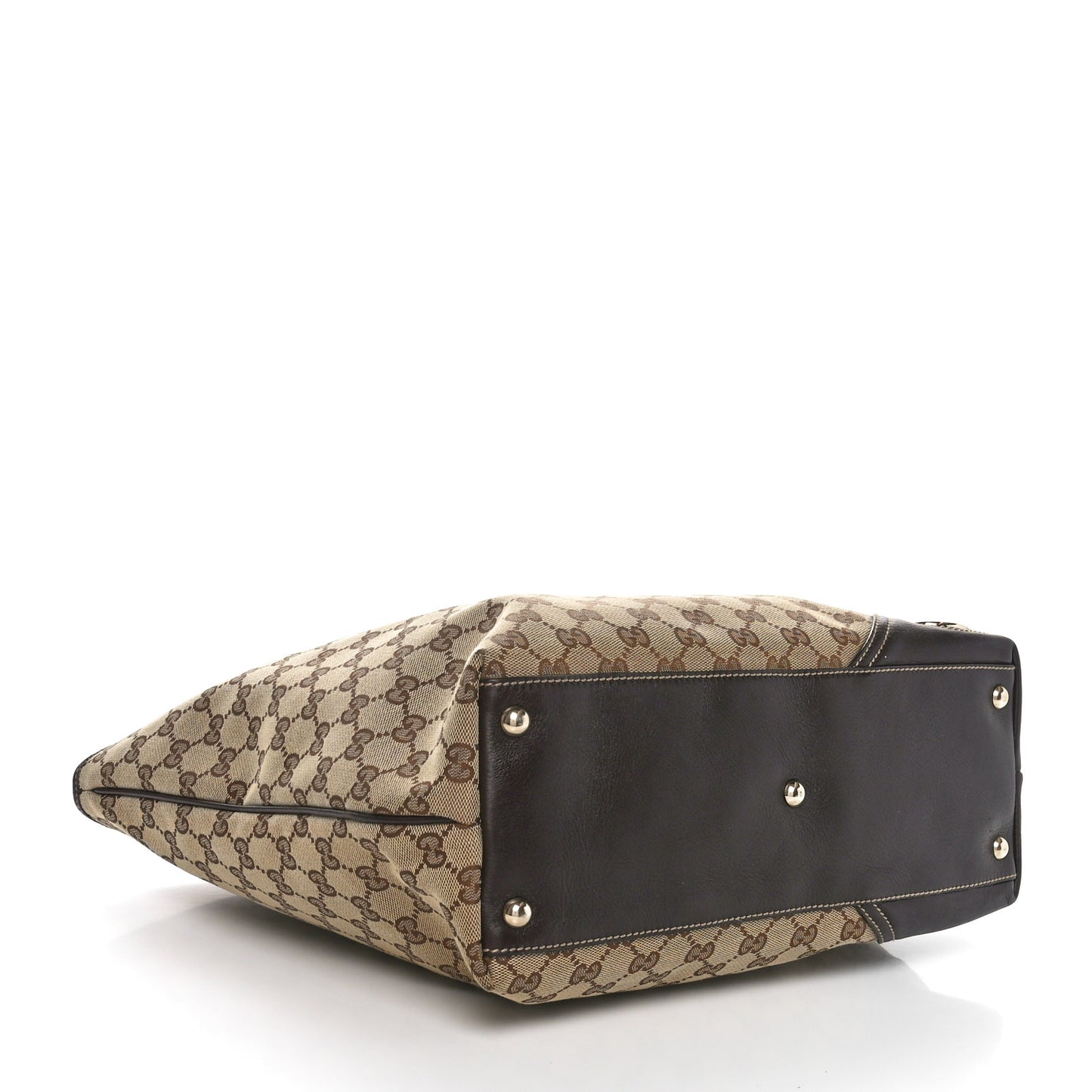 This is an authentic GUCCI Monogram Large New Britt Tote in Brown. This stylish hobo is finely crafted of brown on beige Gucci GG monogram canvas. The bag features off-white leather shoulder straps and trim, accented with gold hardware.Follow this item for alerts. Gucci is a registered trademark of Gucci. FASHIONPHILE is not affiliated with Gucci.
