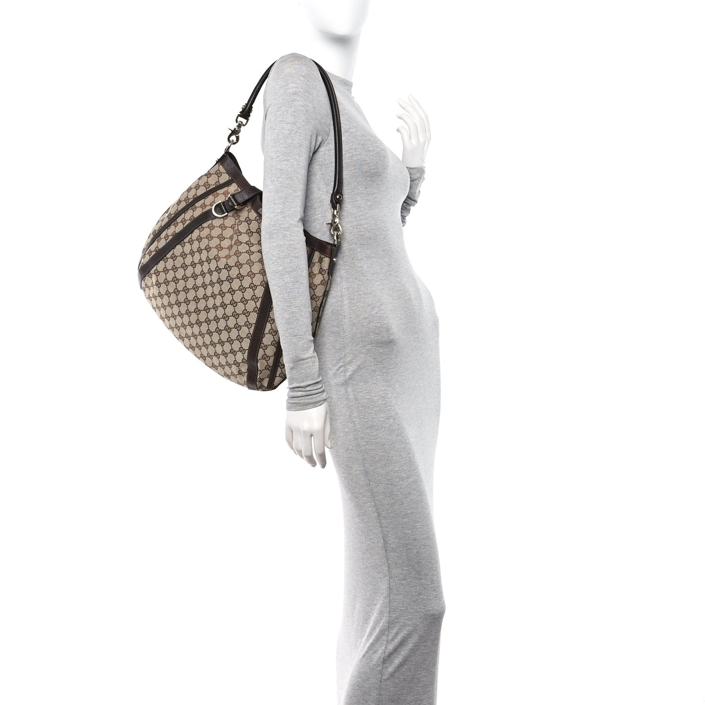 This is an authentic GUCCI Monogram Medium Abbey Convertible Tote in Dark Brown. This chic tote is crafted of Gucci GG monogram canvas. The bag features dark brown leather trim, top handles, and an optional rolled leather shoulder strap with polished light gold hardware. The top of the bag is open to a dark brown fabric interior with a zipper pocket.Follow this item for alerts. Gucci is a registered trademark of Gucci. FASHIONPHILE is not affiliated with Gucci.