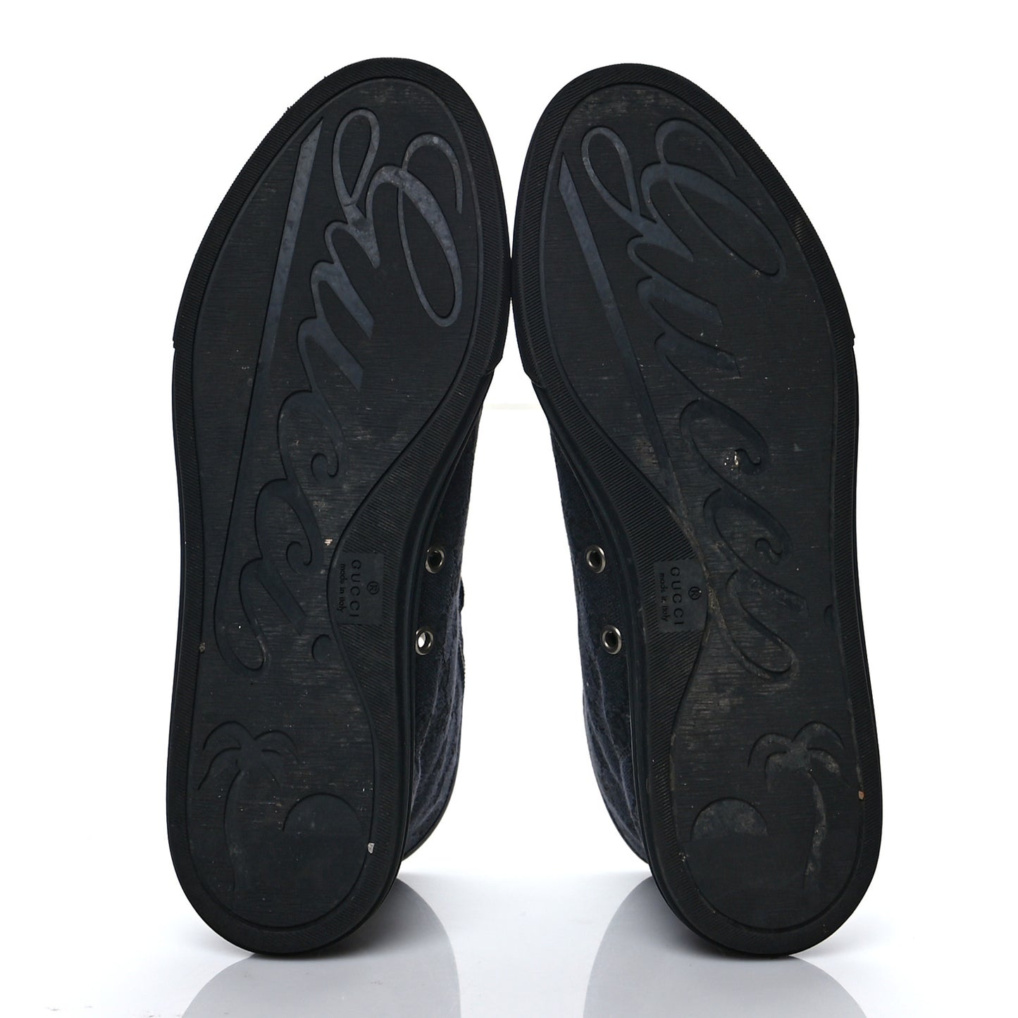 This is an authentic pair of GUCCI Monogram Mens High Top Sneakers size 7.5 in Black. These stylish high top sneakers are crafted of black monogrammed canvas, with black rubber soles, and black leather trim.