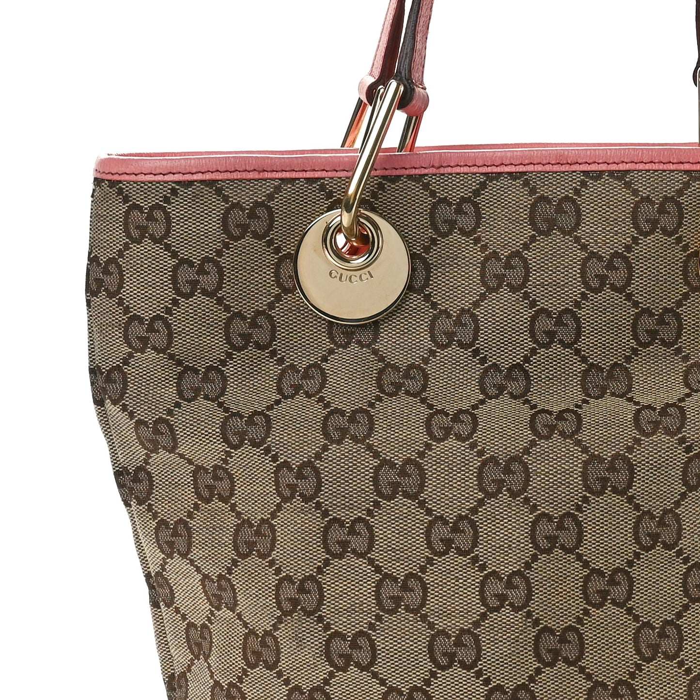 This is an authentic GUCCI Monogram Small Eclipse Tote in Pink. The bag is a smaller tote crafted of brown on beige Gucci GG canvas. The tote has a base of solid pink cowhide leather with feet and leather trim at the top rim. There are tall strap pink leather handles. These handles have stylish rings with the stylized eclipse polished brass eyelet details. The interior of the bag is a pink fabric with zipper and patch pockets.Follow this item for alerts. Gucci is a registered trademark of Gucci. FASHIONPHILE is not affiliated with Gucci.