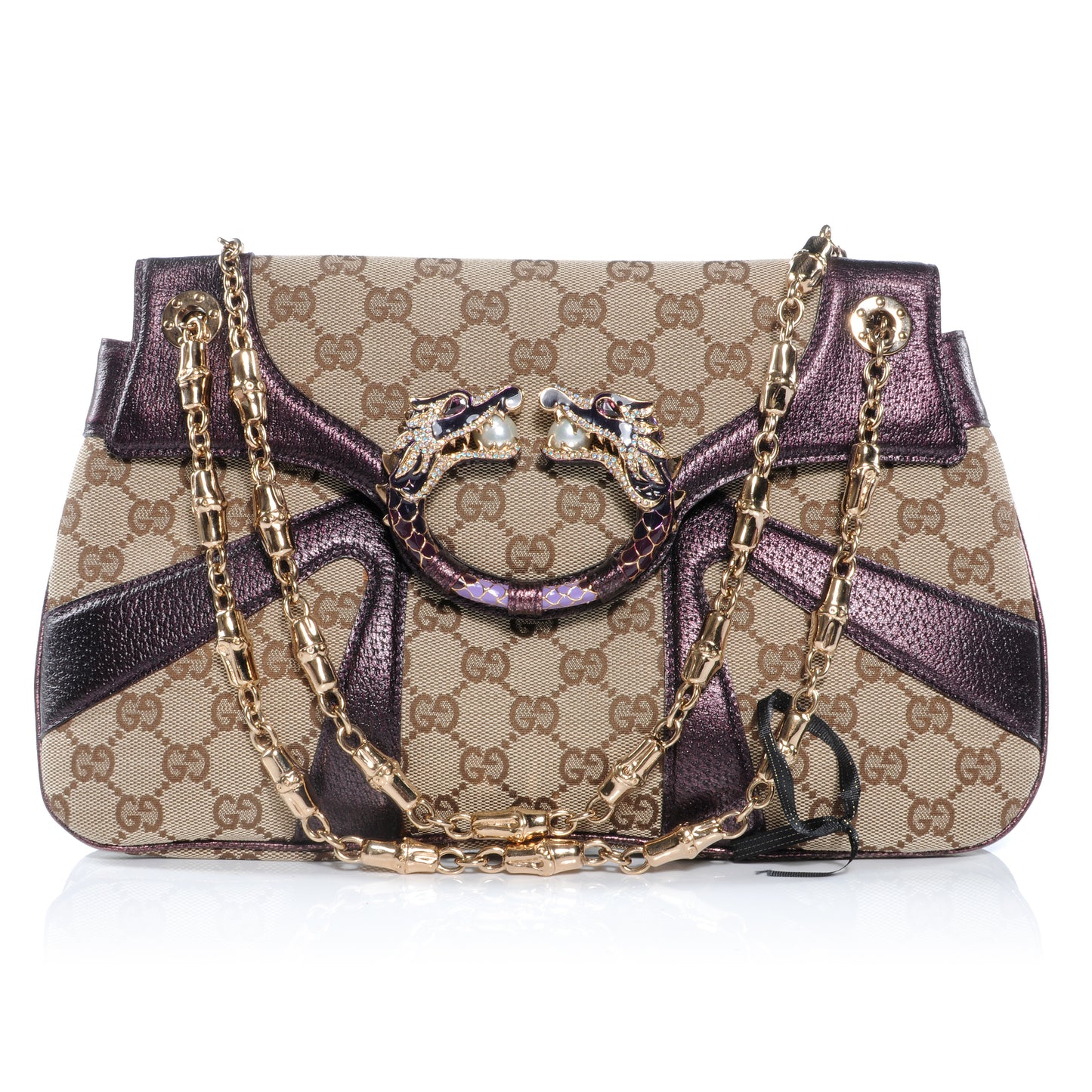 This is an authentic GUCCI Monogram Tom Ford Jeweled Dragon Bag. This chic baguette is crafted of Gucci GG monogram canvas embellished with trim of metallic purple leather. The bag features gold chain shoulder straps with bamboo shaped links and a double headed dragon central feature with a pearl in the mouth of each. This opens the frontal flap to a fabric interior. This is a marvelous bag for special events, from Gucci!Follow this item for alerts. Gucci is a registered trademark of Gucci. FASHIONPHILE is not affiliated with Gucci.