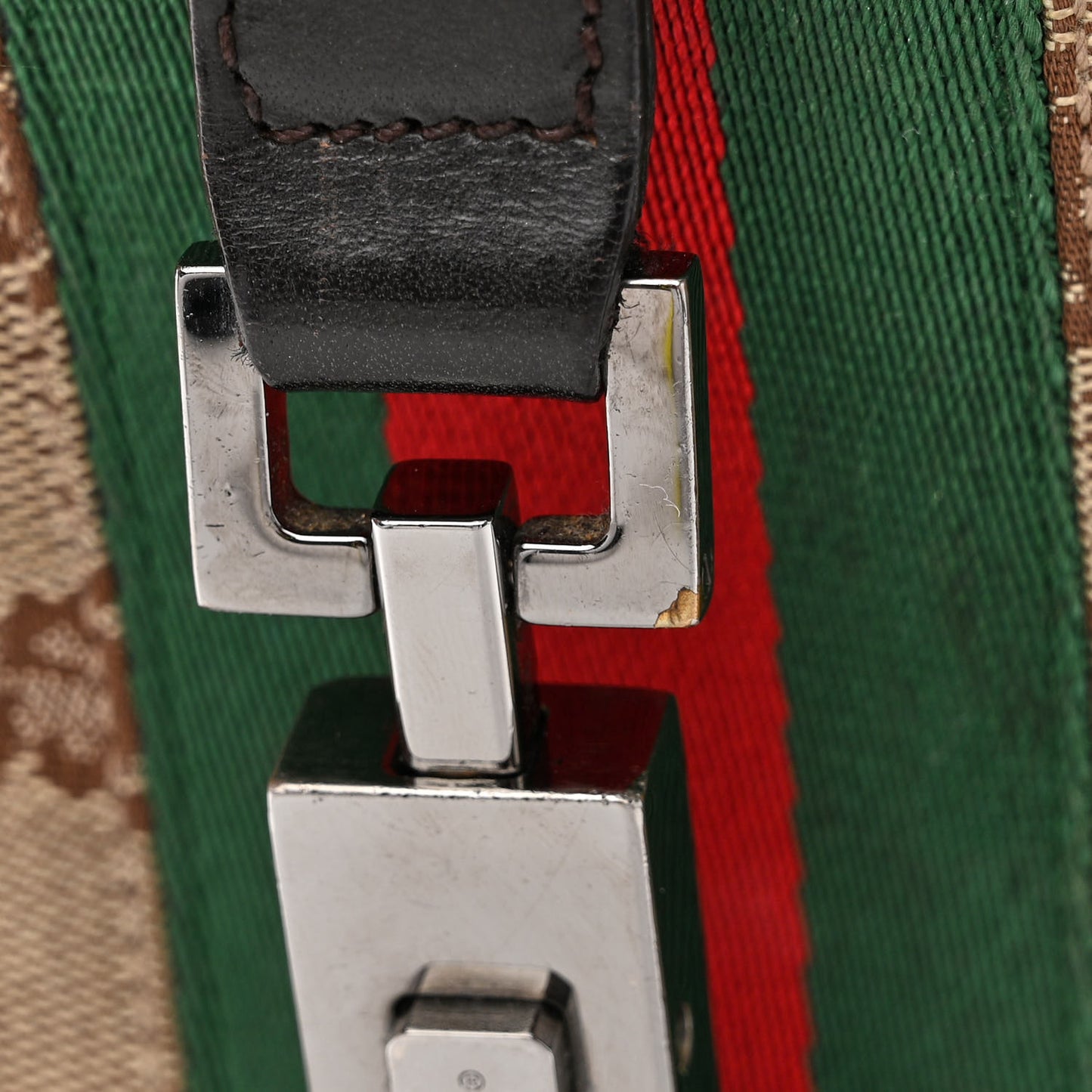 This is an authentic GUCCI Monogram Web Jackie O Hobo in Dark Brown. This shoulder bag is crafted of brown monogram canvas with brown leather trim. The bag features a green and red web stripe down the center, a brown leather adjustable shoulder strap, and crossover strap with silver-plated piston lock. This opens to a cocoa brown fabric interior with a zipper pocket.Follow this item for alerts. Gucci is a registered trademark of Gucci. FASHIONPHILE is not affiliated with Gucci.