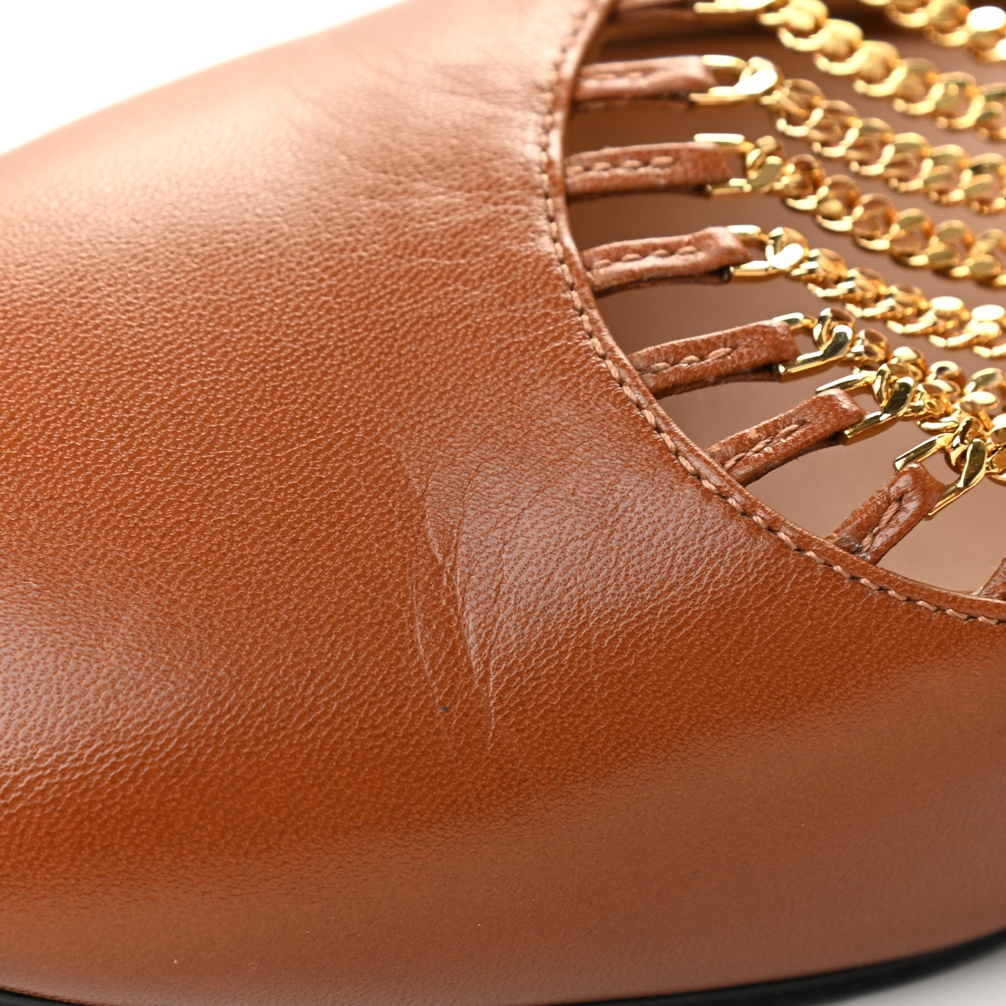 This is an authentic pair of GUCCI Nappa Crystal Bonny Bow Mary Jane Pumps size 36.5 in Brown. These unique shoes are crafted of brown leather, featuring golden chains and a crystal encrusted leather bow with a small GG at heel in gold.Follow this item for alerts. Gucci is a registered trademark of Gucci. FASHIONPHILE is not affiliated with Gucci.