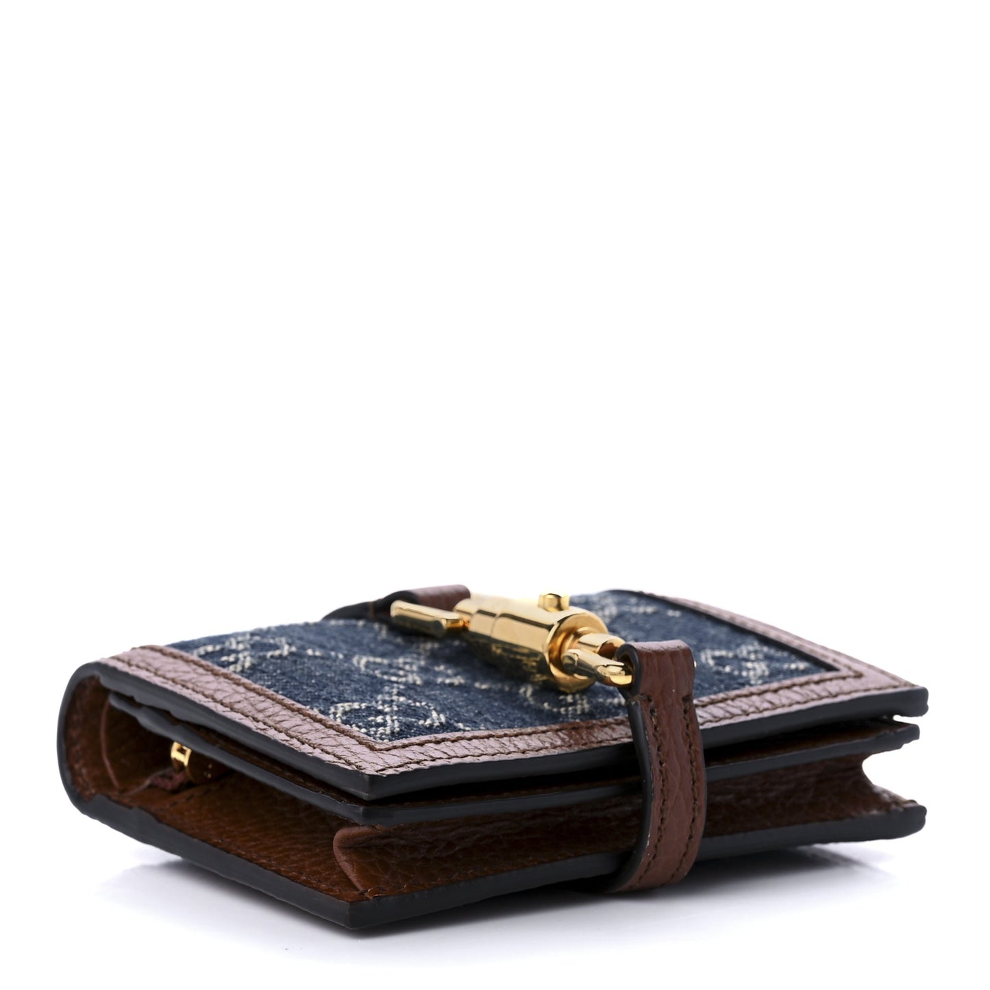 This is an authentic GUCCI Denim GG Supreme Monogram Jackie 1961 Card Case in Blue Tea and Cuir. This stylish wallet is crafted of Gucci GG monogram denim fabric with brown leather trim. This wallet features a gold horsebit piston lock. The flap opens to a brown leather interior with card slots, a zipper compartment, and a billfold.Follow this item for alerts. Gucci is a registered trademark of Gucci. FASHIONPHILE is not affiliated with Gucci.