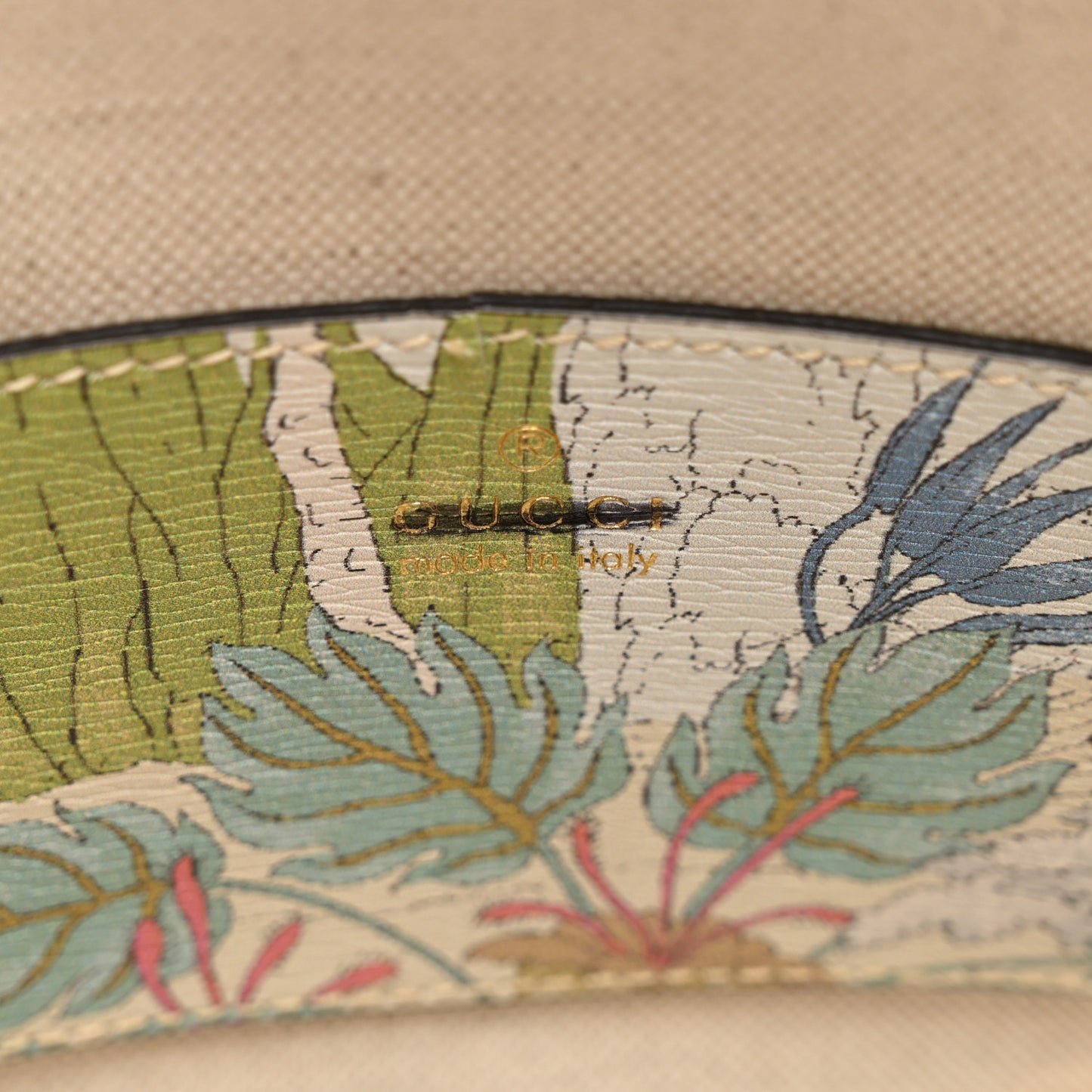 This is an authentic GUCCI New Shangai Calfskin Tiger Savanah Web Mini Horsebit 1955 Top Handle Bag in Chalky White Multicolor. This stylish bag is crafted of multicolor calfskin leather and features "Gucci Tiger" in blue. The bag features a horsebit detail at front, leather strap top handles, 2 optional adjustable shoulder straps, and gold hardware. The top zipper opens to a beige fabric interior with a pocket.Follow this item for alerts. Gucci is a registered trademark of Gucci. FASHIONPHILE is not affiliated with Gucci.