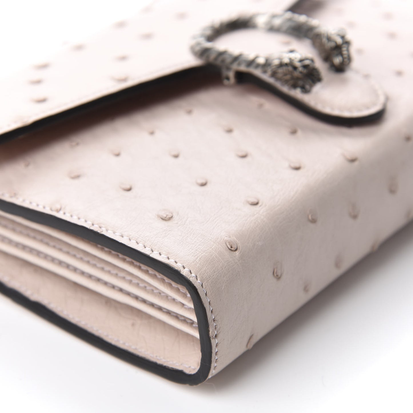 This is an authentic GUCCI Ostrich Mini Dionysus Chain Wallet in Pink. This stylish bag is crafted of Ostrich leather in light pink. This bag features and optional silver chain shoulder strap and a silver horseshoe closure with tiger heads at the end. This opens to a purple fabric and pink leather interior with card slots, zipper and patch pockets.