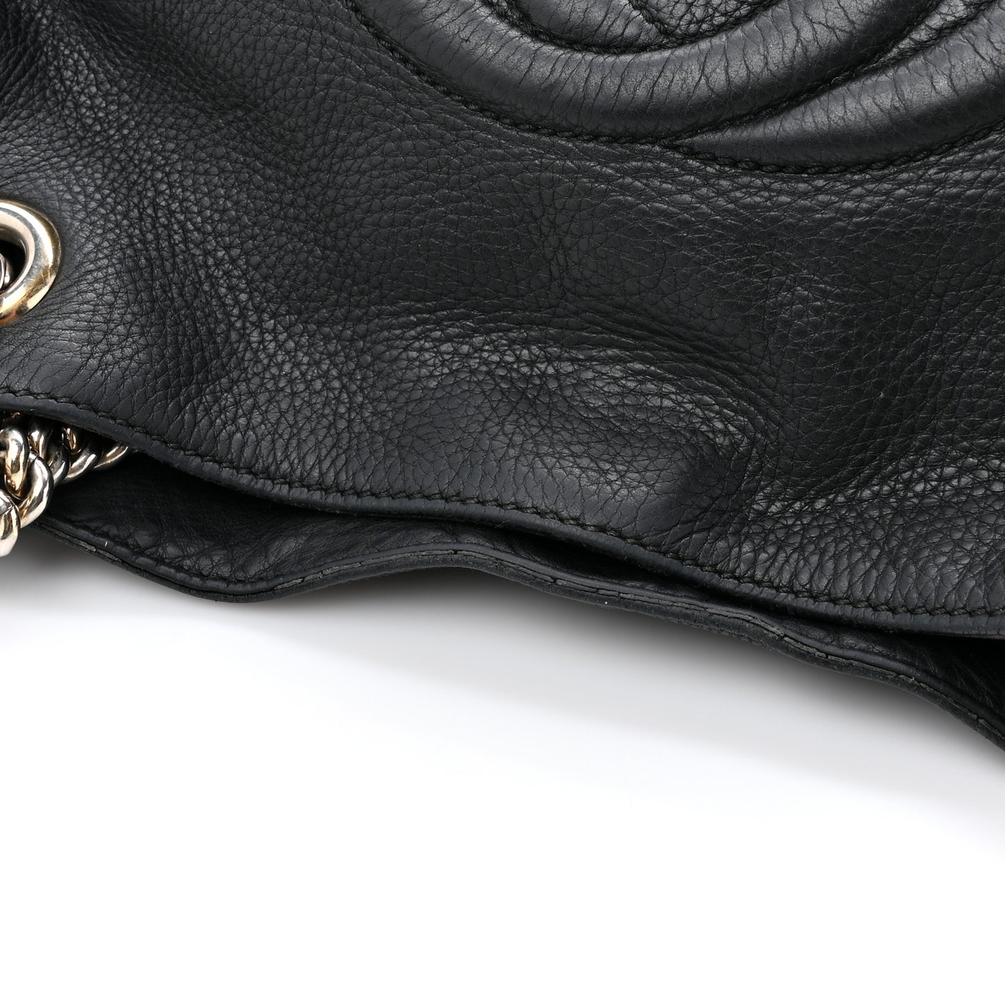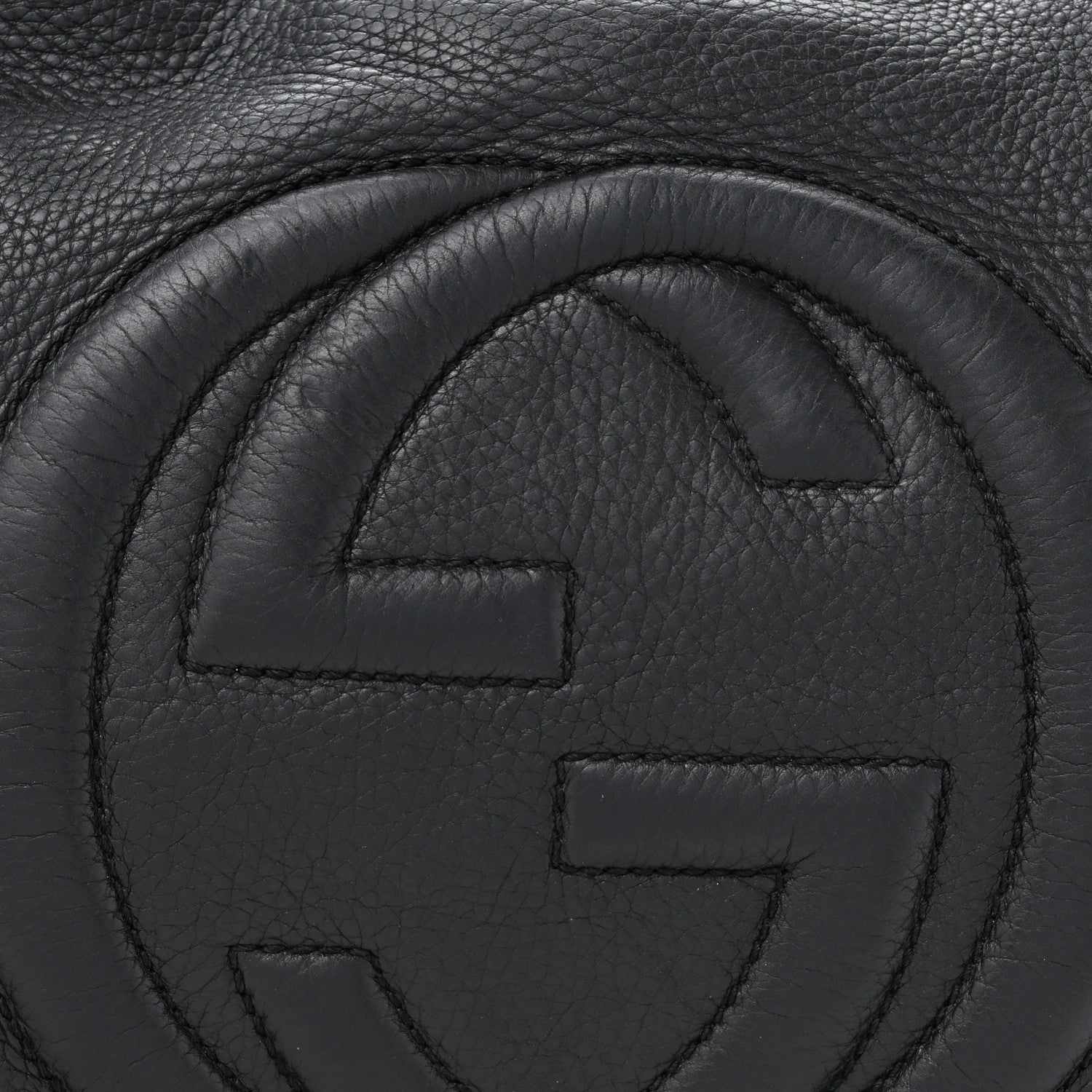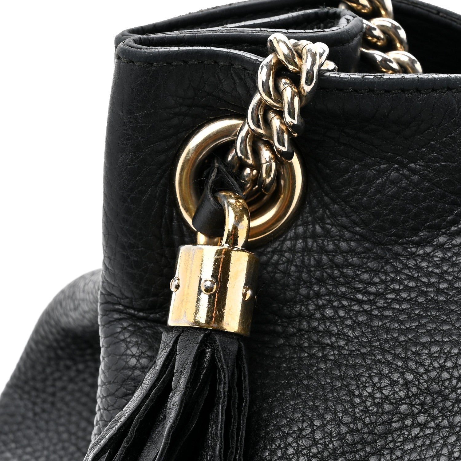 This is an authentic GUCCI Pebbled Calfskin Medium Soho Chain Shoulder Bag in Black. This shoulder bag is crafted of textured calfskin leather in black. The bag features a prominent interlocking GG quilted logo on the front, polished light gold chainlink shoulder straps with black leather shoulder pads, and a decorative tassel. The top is open to a beige linen fabric interior with zipper and patch pockets.Follow this item for alerts. Gucci is a registered trademark of Gucci. FASHIONPHILE is not affiliated with Gucci.