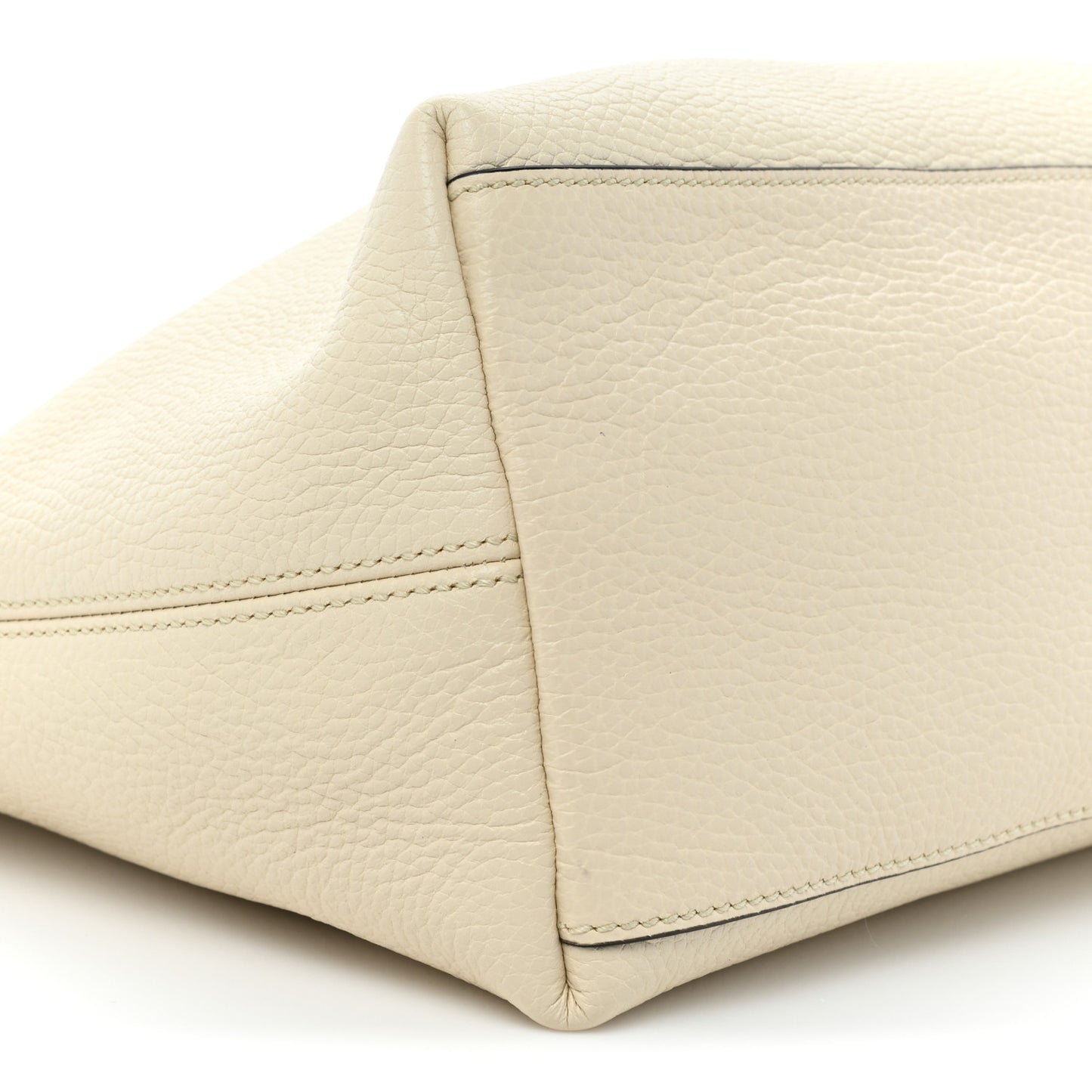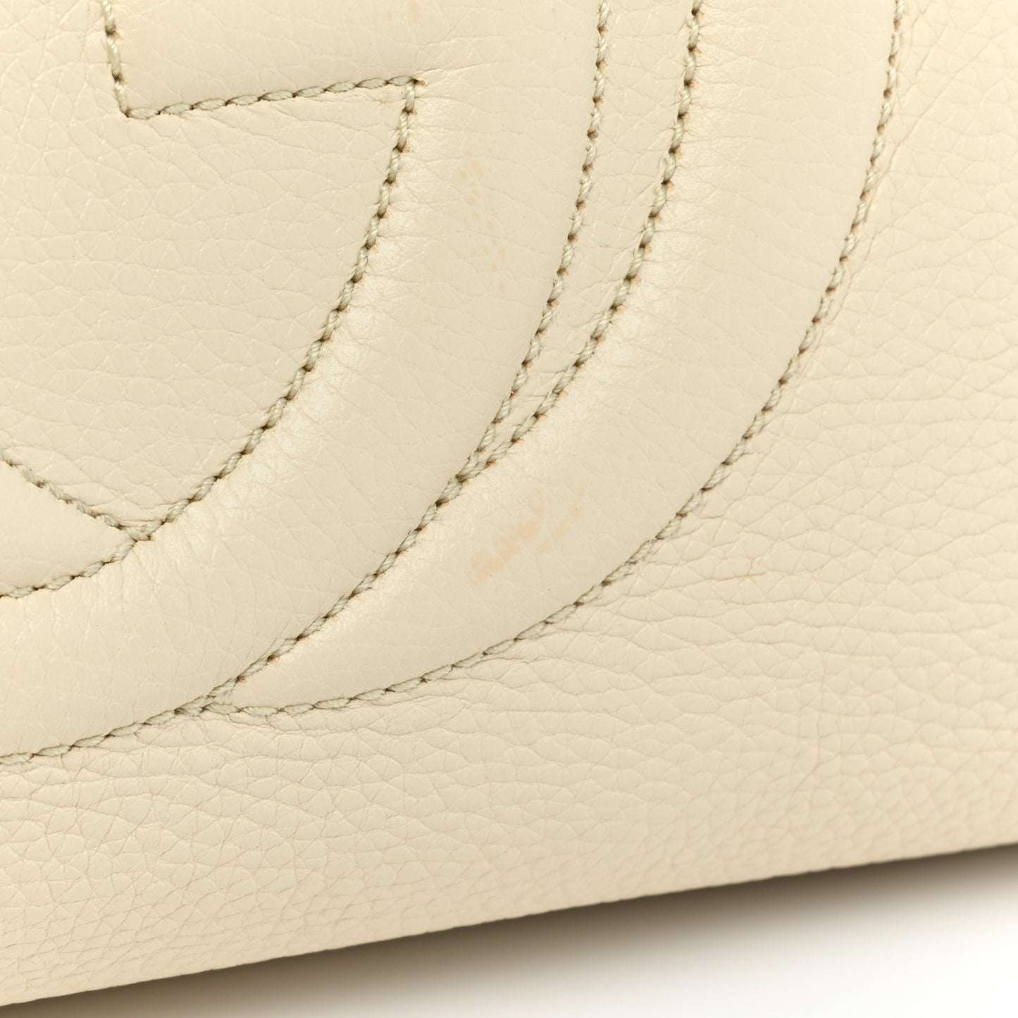 This is an authentic GUCCI Cellarius Calfskin Medium Soho Chain Shoulder Bag in Ivoire. This shoulder bag is crafted of textured calfskin leather in off white. The bag features a prominent front interlocking GG quilted logo, polished light gold chain link shoulder straps with shoulder pads, and a decorative light gold knobbed tassel. The shoulder bag opens to a beige linen fabric interior with zipper and patch pockets.Follow this item for alerts. Gucci is a registered trademark of Gucci. FASHIONPHILE is not affiliated with Gucci.