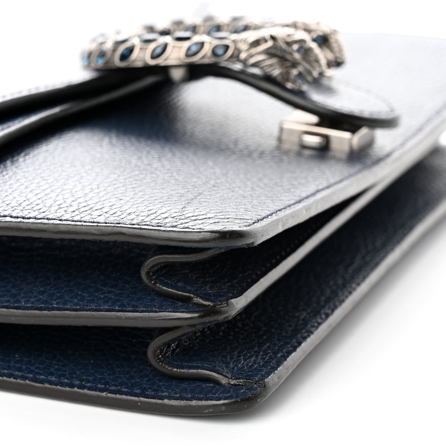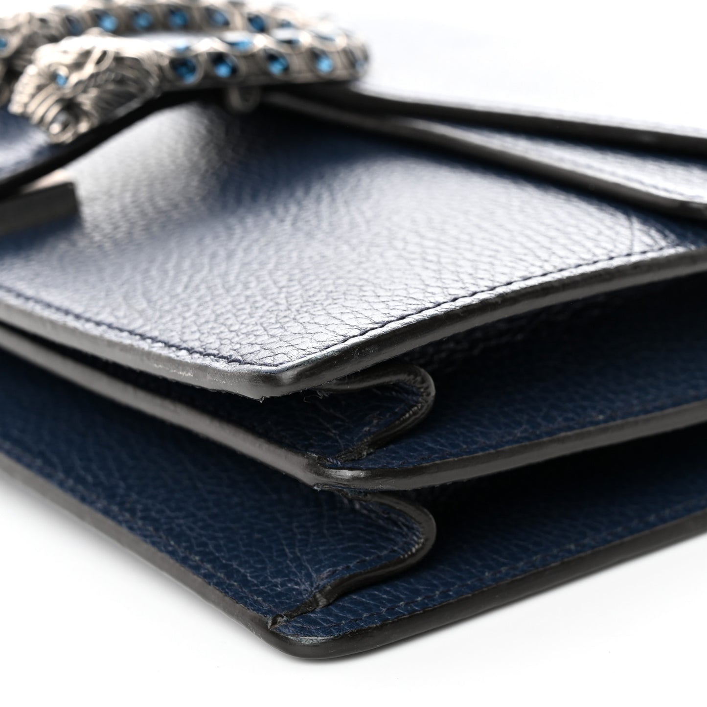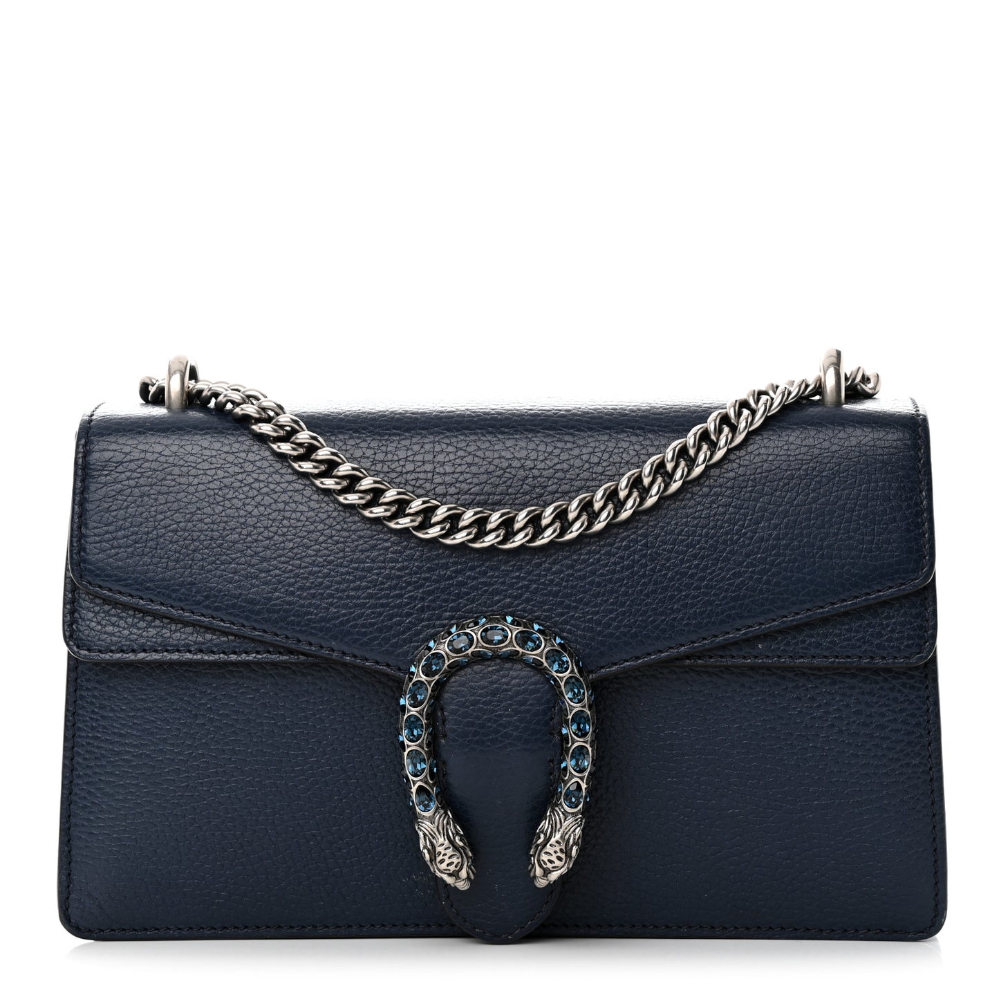 This is an authentic GUCCI Dollar Calfskin Crystal Small Dionysus Shoulder Bag in Blue Agata and Montana Sapphire. This stylish bag is crafted of textured calfskin leather in navy blue. The bag features an aged silver chain shoulder strap and a horseshoe closure embellished with blue crystals and tiger heads at each end. This opens to a front hidden flap pocket and a natural fabric interior with a central zipper compartment.Follow this item for alerts. Gucci is a registered trademark of Gucci. FASHIONPHILE is not affiliated with Gucci.