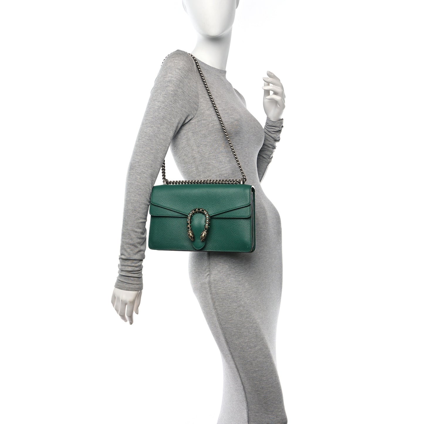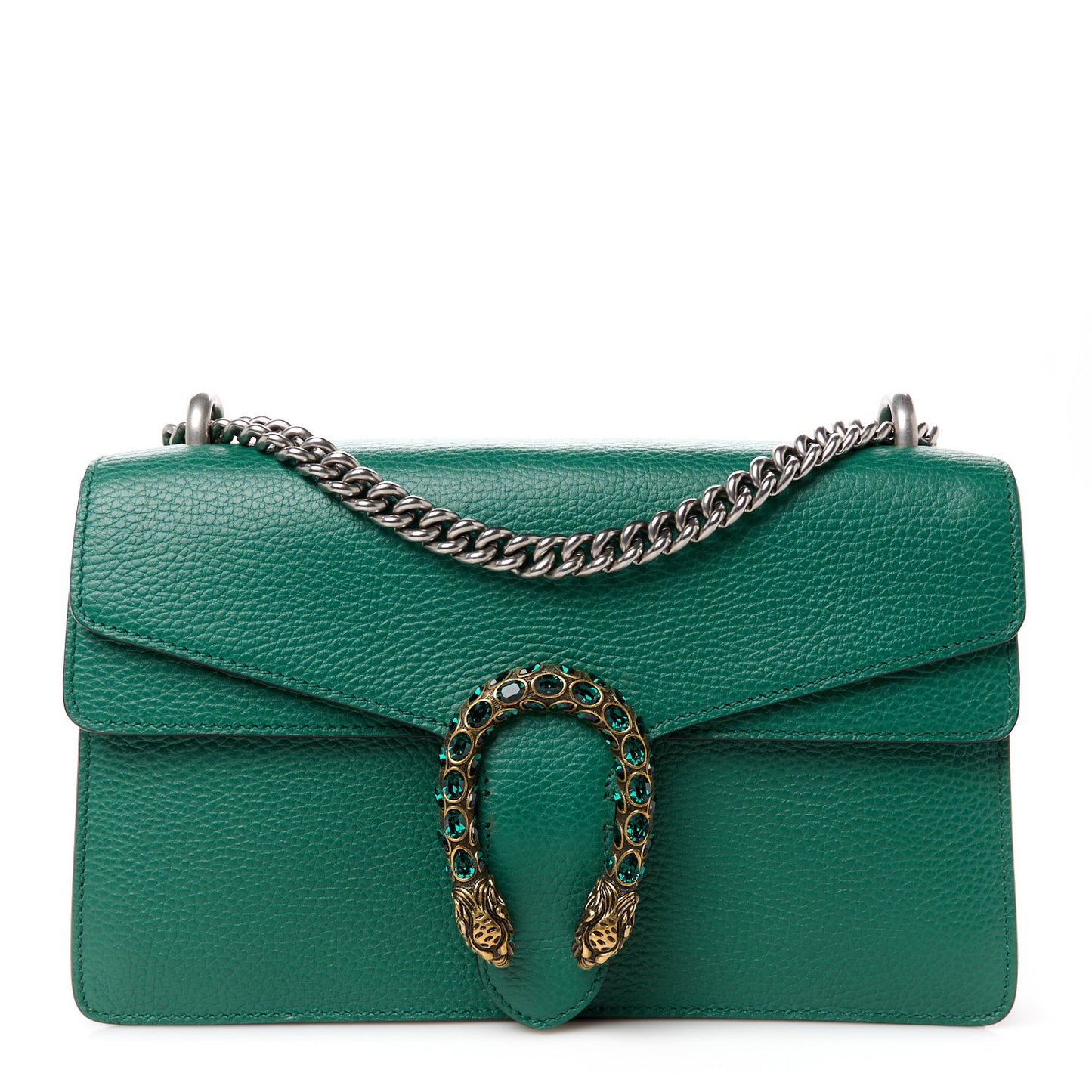 This is an authentic GUCCI Pebbled Calfskin Small Dionysus Shoulder Bag in Emerald. This stylish bag is crafted of textured calfskin leather in green. This shoulder bag features a silver chain shoulder strap and a textured horseshoe closure with green crystal stones and lion heads at the end. This opens to a beige fabric interior with a central zipper pocket and a front flap pocket.Follow this item for alerts. Gucci is a registered trademark of Gucci. FASHIONPHILE is not affiliated with Gucci.