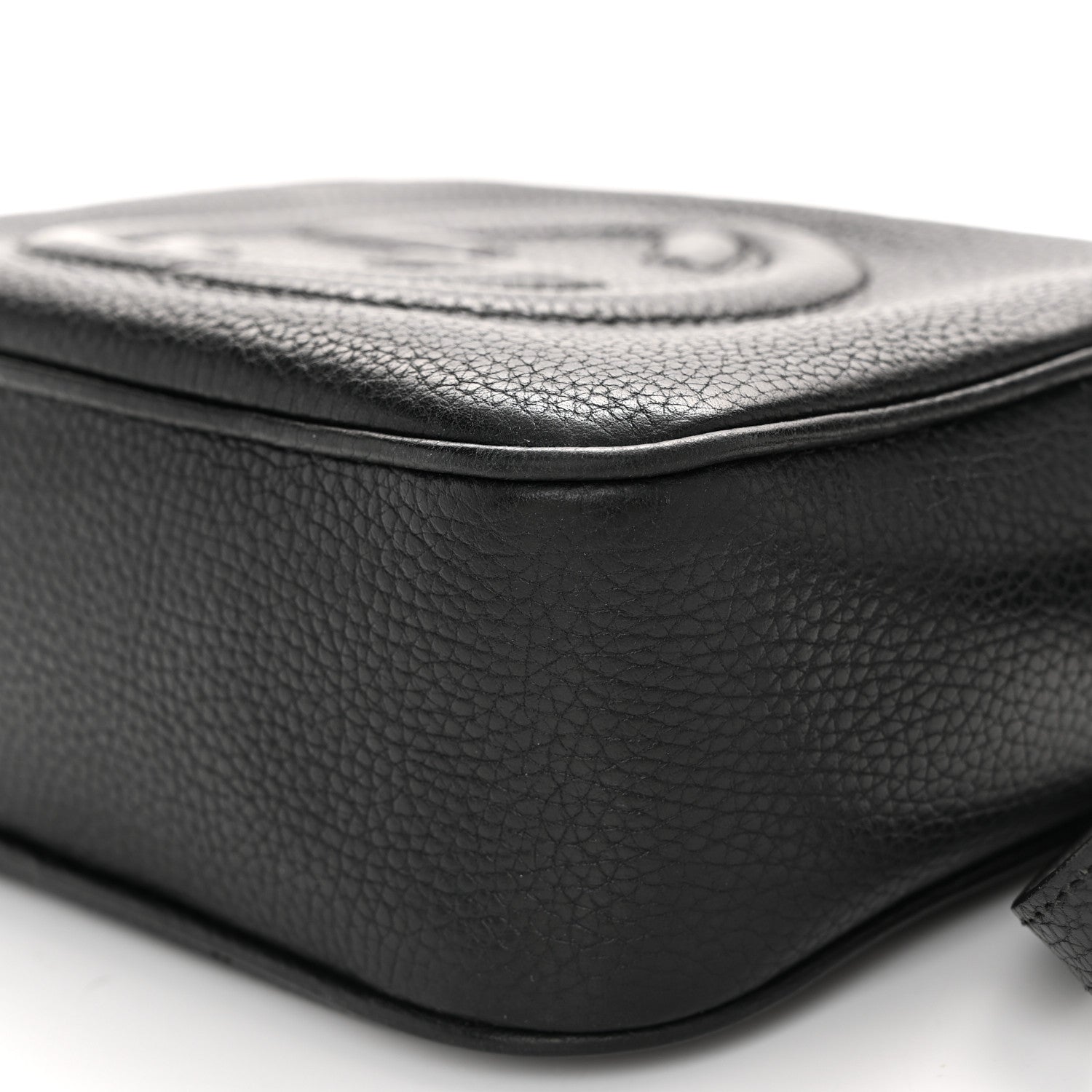 This is an authentic GUCCI Pebbled Calfskin Small Soho Disco Bag in Black. This stylish crossbody bag is crafted of textured calfskin leather in black with an interlocking G logo stitched on the front. The bag features an adjustable leather shoulder strap and a polished gold knobbed leather tasseled zipper pull. The top zipper opens to a beige fabric interior with patch pockets.Follow this item for alerts. Gucci is a registered trademark of Gucci. FASHIONPHILE is not affiliated with Gucci.