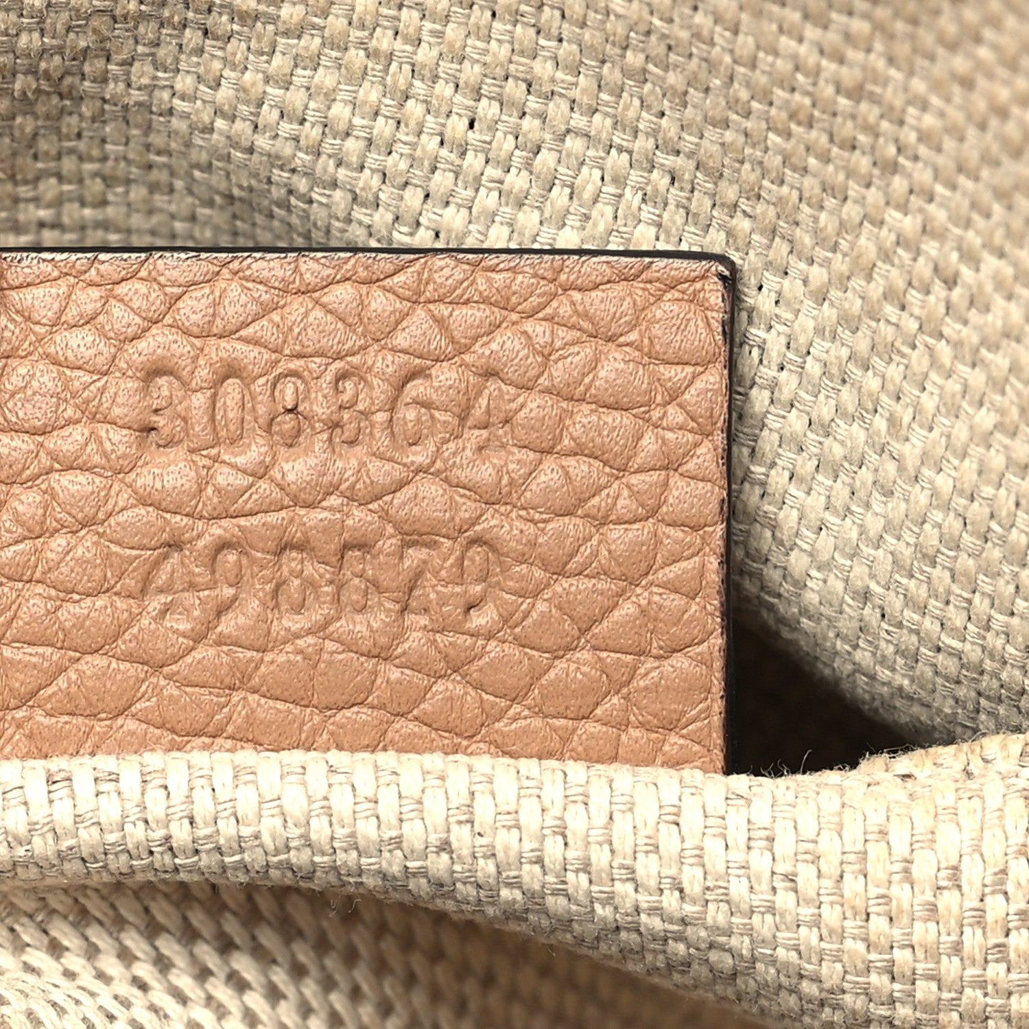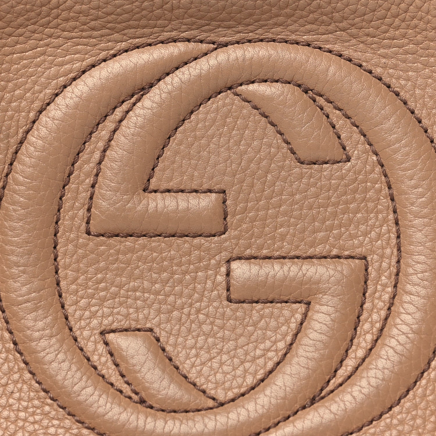 This is an authentic GUCCI Pebbled Calfskin Small Soho Disco Bag in Camelia. This stylish crossbody bag is crafted of pebbled calfskin leather in rose-toned beige. The bag features an adjustable leather shoulder strap with gold hardware and a prominent GG logo stitched on the front. The leather tassel zipper pull opens the bag to a natural fiber interior with patch pockets.Follow this item for alerts. Gucci is a registered trademark of Gucci. FASHIONPHILE is not affiliated with Gucci.