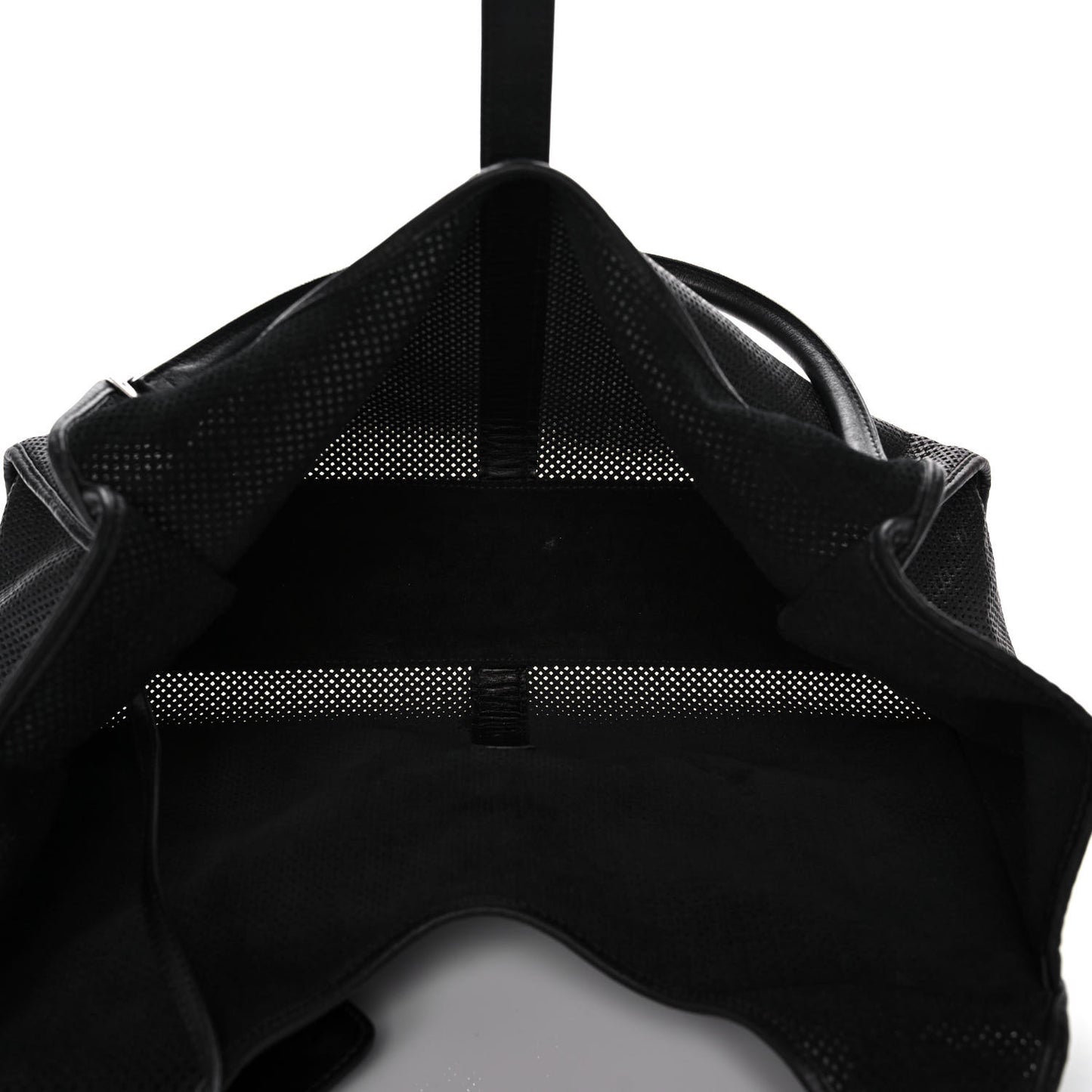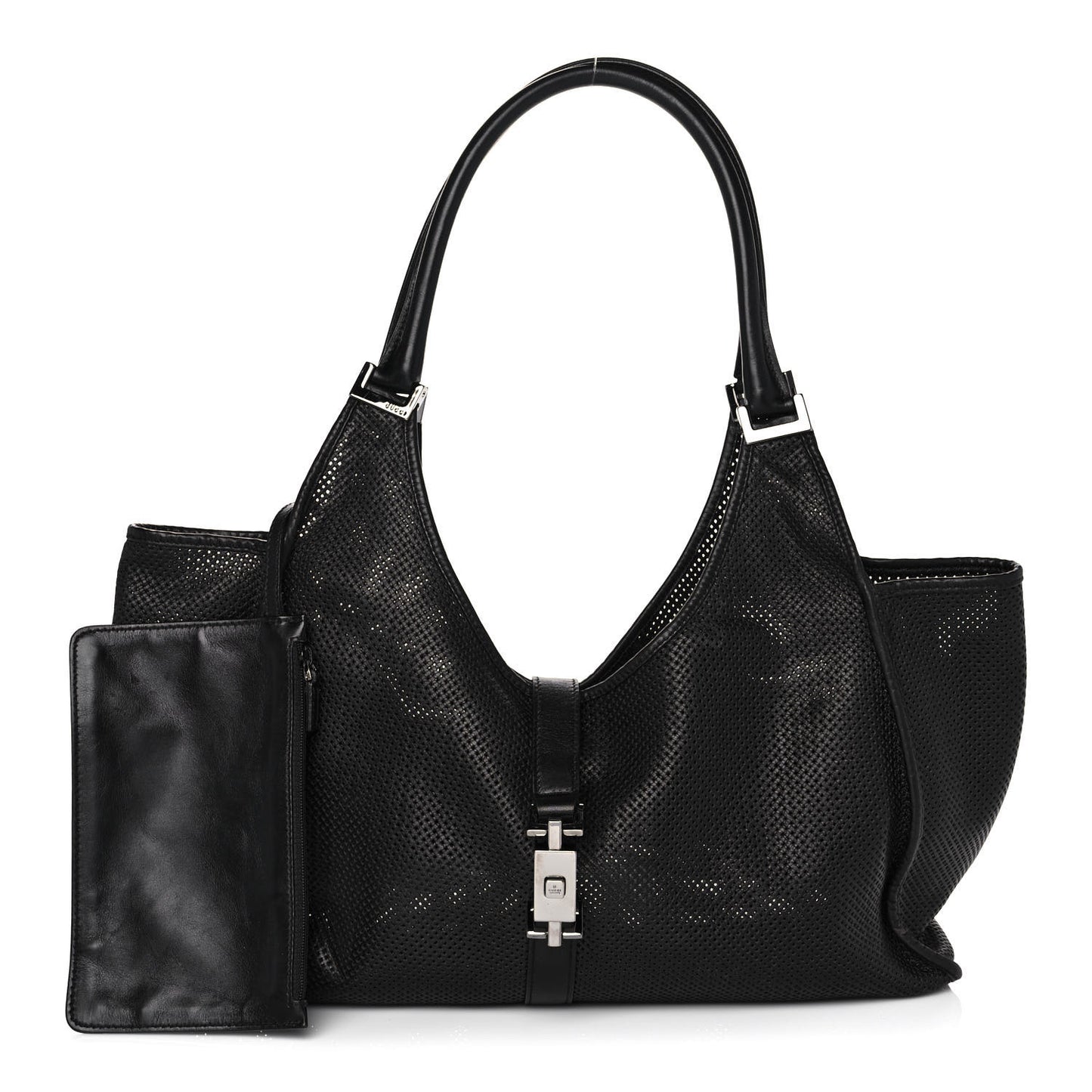 This is an authentic GUCCI Perforated Calfskin Jackie O Hobo in Black. This bag is crafted of perforated calfskin leather in black with silver hardware. This bag features a looping leather shoulder strap and a crossover strap with a piston lock closure. This opens to a black interior with a matching zippered pouch.Follow this item for alerts. Gucci is a registered trademark of Gucci. FASHIONPHILE is not affiliated with Gucci.