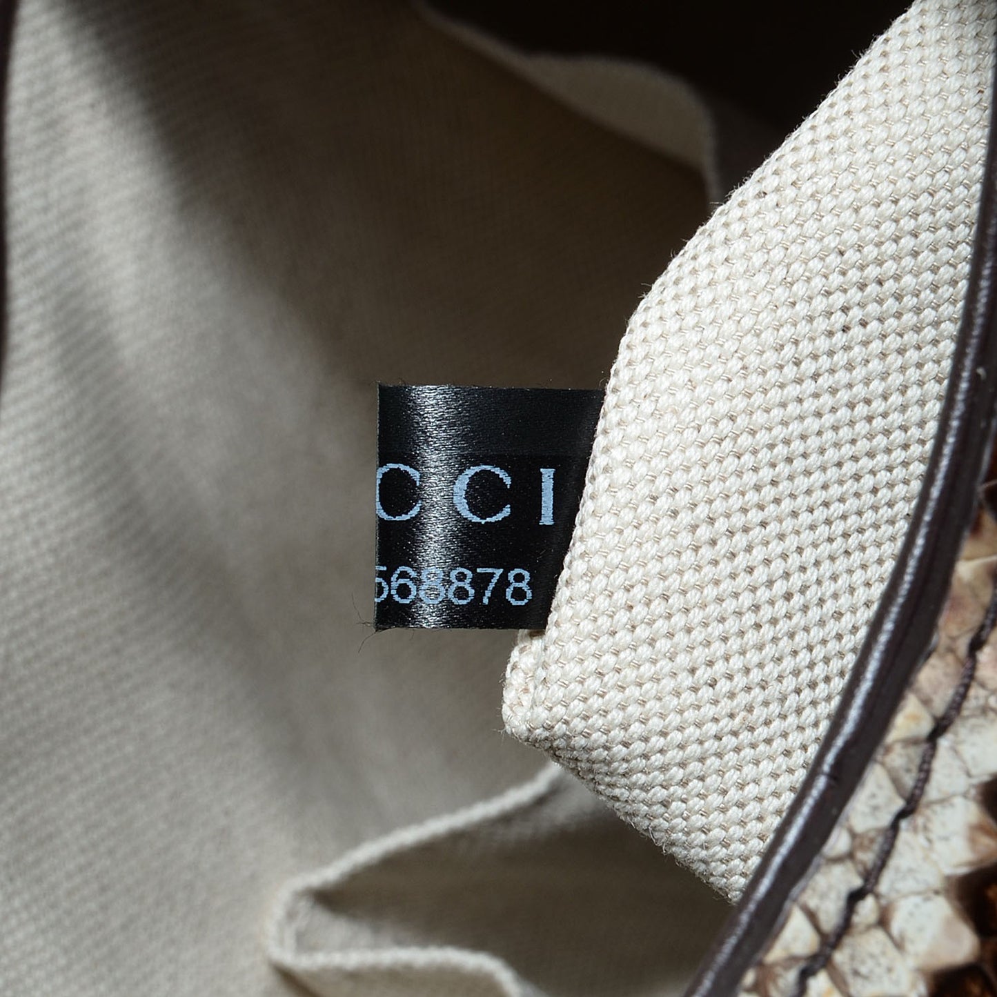 This is an authentic GUCCI Python Stirrup Medium Top Handle Bag in Brown. This stylish top handle tote is crafted of richly colored python in tonal browns. The bag features looping leather top handles with brass links and a cross-over strap with a polished brass horsebit inspired buckle. This opens to a coarse white natural fiber, ideal for day or evening necessities, with the sophisticated style of Gucci.Follow this item for alerts. Gucci is a registered trademark of Gucci. FASHIONPHILE is not affiliated with Gucci.