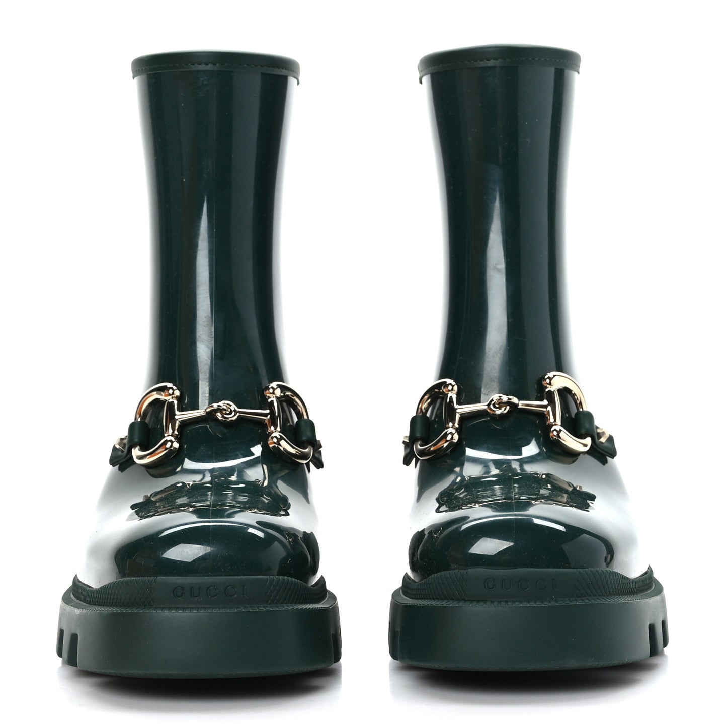 This is an authentic pair of GUCCI Rubber Womens Horsebit Ankle Boots size 39 in Vintage Green. These stylish boots are crafted of supple dark green rubber textile, with a gold horsebit embellishment, squared toe and rubber soles.Follow this item for alerts. Gucci is a registered trademark of Gucci. FASHIONPHILE is not affiliated with Gucci.