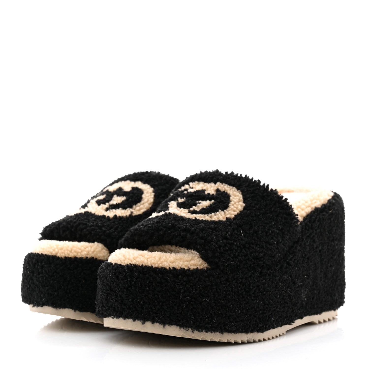 Gucci/ Accessories/ Shoes /Gucci Shearling Interlocking G Womens Elea Platform Slide Wedge Sandals 38 Black Butterscotch