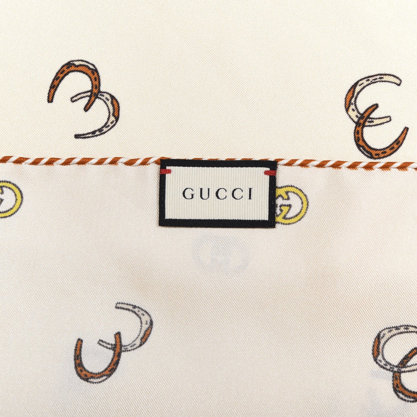 This is an authentic GUCCI Silk GG Horseshoe Print Pocket Square Scarf in Ivory. This stunning scarf is crafted of 100% silk with an interlocking GG logo and horseshoe design. This is a perfect scarf with one of a kind look, from Gucci!Follow this item for alerts. Gucci is a registered trademark of Gucci. FASHIONPHILE is not affiliated with Gucci.