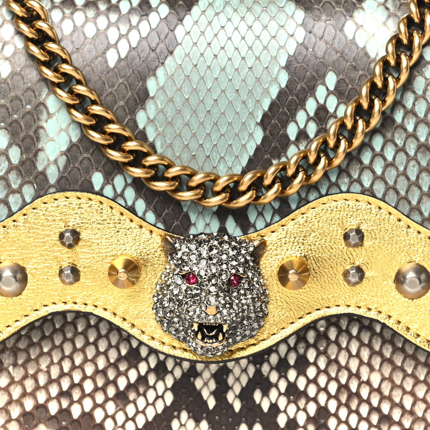 This is an authentic GUCCI Snakeskin Animalier Broadway Clutch in Pink. This chic clutch is crafted of smooth calfskin leather in Blue and Beige. It features a prominent front flap detailed with a crystal encrusted tiger, and an optional gold chain shoulder strap. The flap opens to a pink satin interior with a patch pocket.Follow this item for alerts. Gucci is a registered trademark of Gucci. FASHIONPHILE is not affiliated with Gucci.