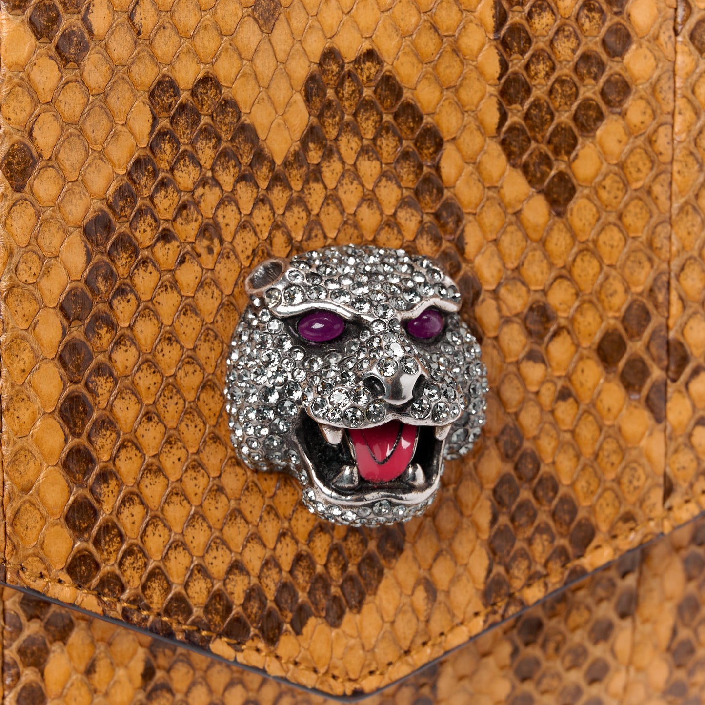 This is an authentic GUCCI Calfskin Medium Thiara Double Envelope Shoulder Bag in Red and Orange. This stylish bag is crafted of red and orange snakeskin. The bag features a gold-toned chainlink strap, a removable, adjustable red snakeskin crossbody strap, and front and back envelope-style flap closures. The orange side features a crystal-encrusted tiger head embellishment, the red side features a classic gold-toned GG logo, and both flaps open with magnetic snaps to beige microfiber interiors with zipper and patch pockets.Follow this item for alerts. Gucci is a registered trademark of Gucci. FASHIONPHILE is not affiliated with Gucci.