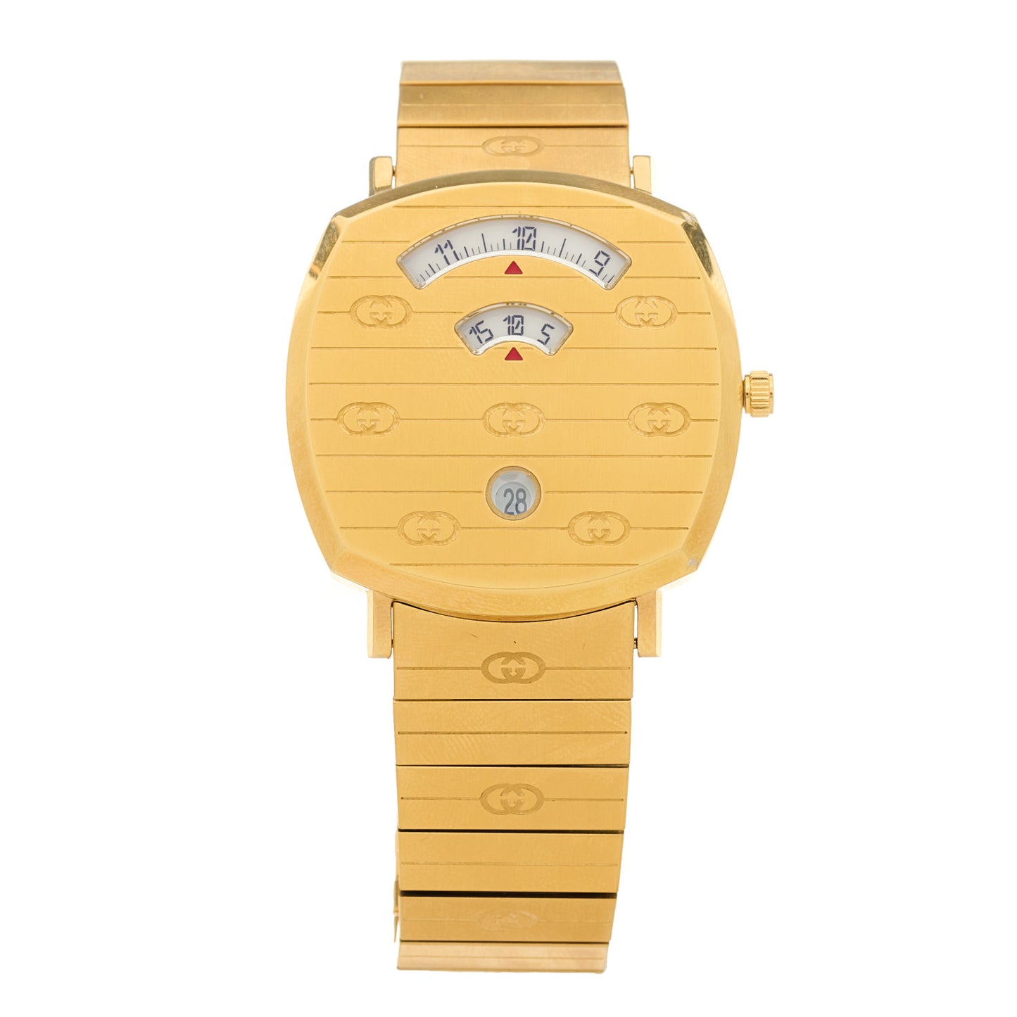 This is an authentic GUCCI Stainless Steel 38mm Grip Quartz Watch Gold. The watch is crafted of brushed stainless steel and features three windows for the hour, minute, and date indicators. The watch also features interlocking G motifs throughout the case and band, and a quartz movement.Follow this item for alerts. Gucci is a registered trademark of Gucci. FASHIONPHILE is not affiliated with Gucci.