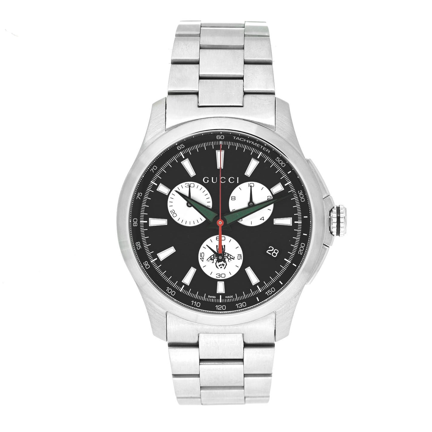 This is an authentic GUCCI Stainless Steel 44mm G-Timeless Bee Chronograph Quartz Watch in Black. The watch is crafted of stainless steel and features a chronograph black dial, silver hands, white hour markers, steel link bracelet, sapphire crystal, and a quartz movement.Follow this item for alerts. Gucci is a registered trademark of Gucci. FASHIONPHILE is not affiliated with Gucci.