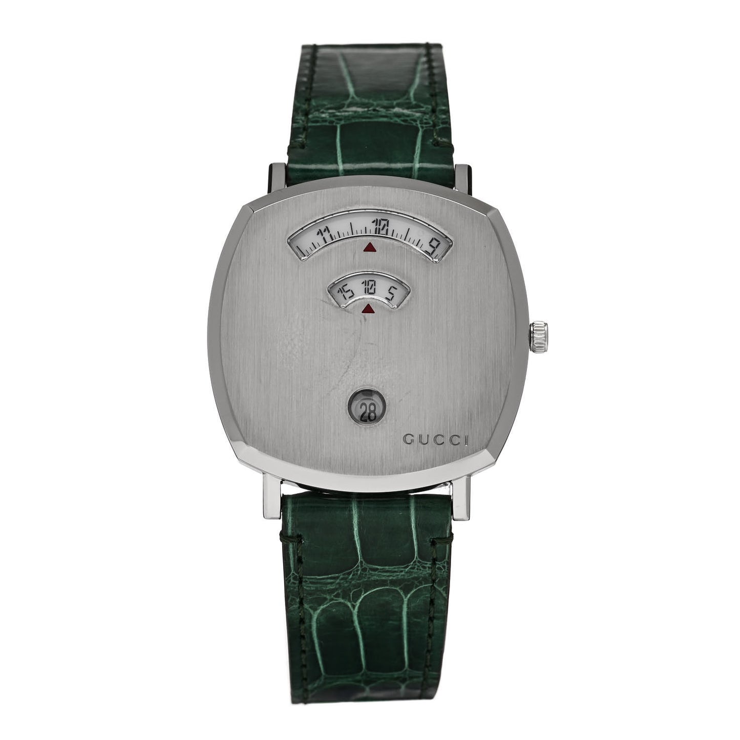 This is an authentic GUCCI Stainless Steel Alligator 38mm Grip Quartz Watch Green. The watch is crafted of brushed stainless steel and features three windows for the hour, minute, and date display. The watch also features a green alligator strap, sapphire crystal, and a quartz movement.