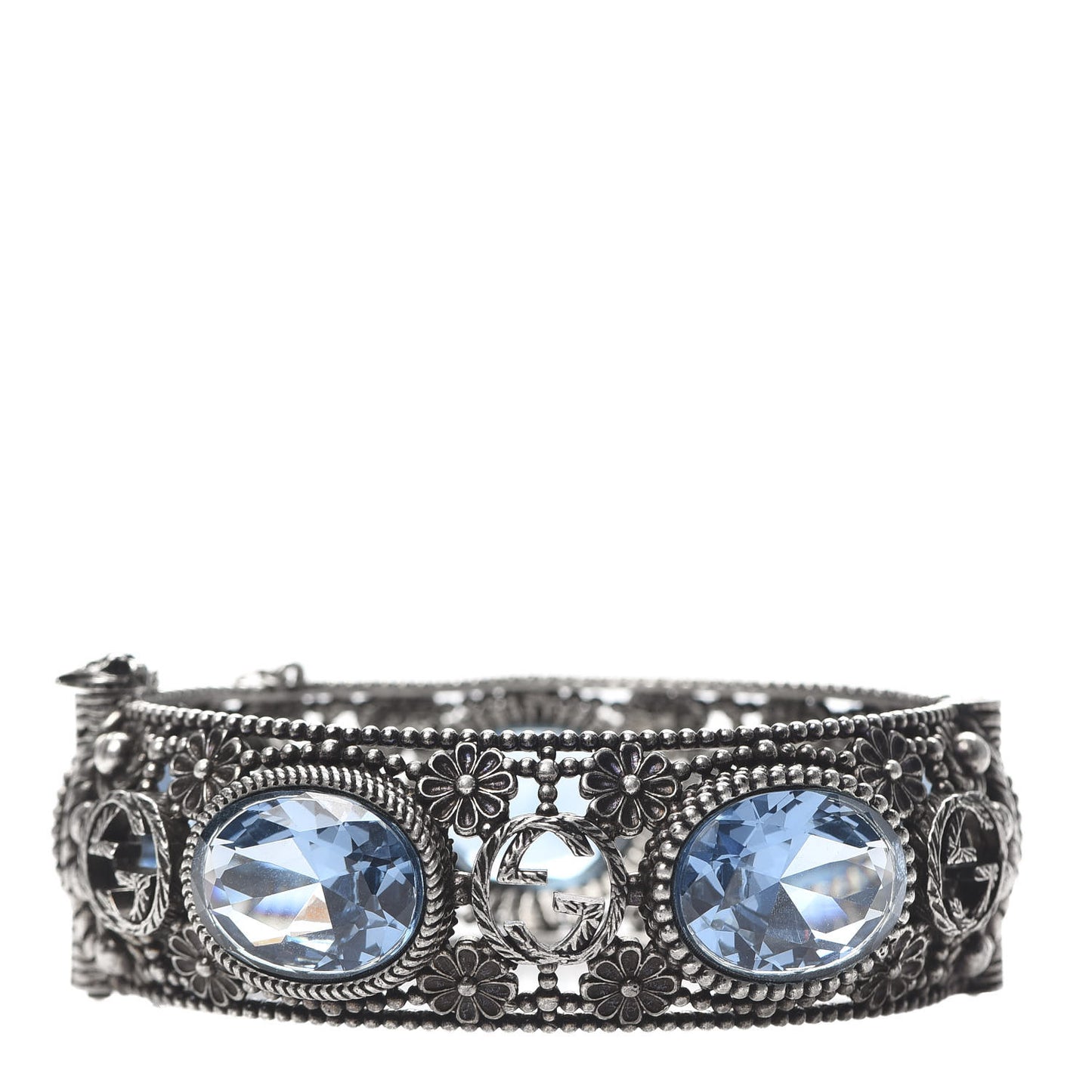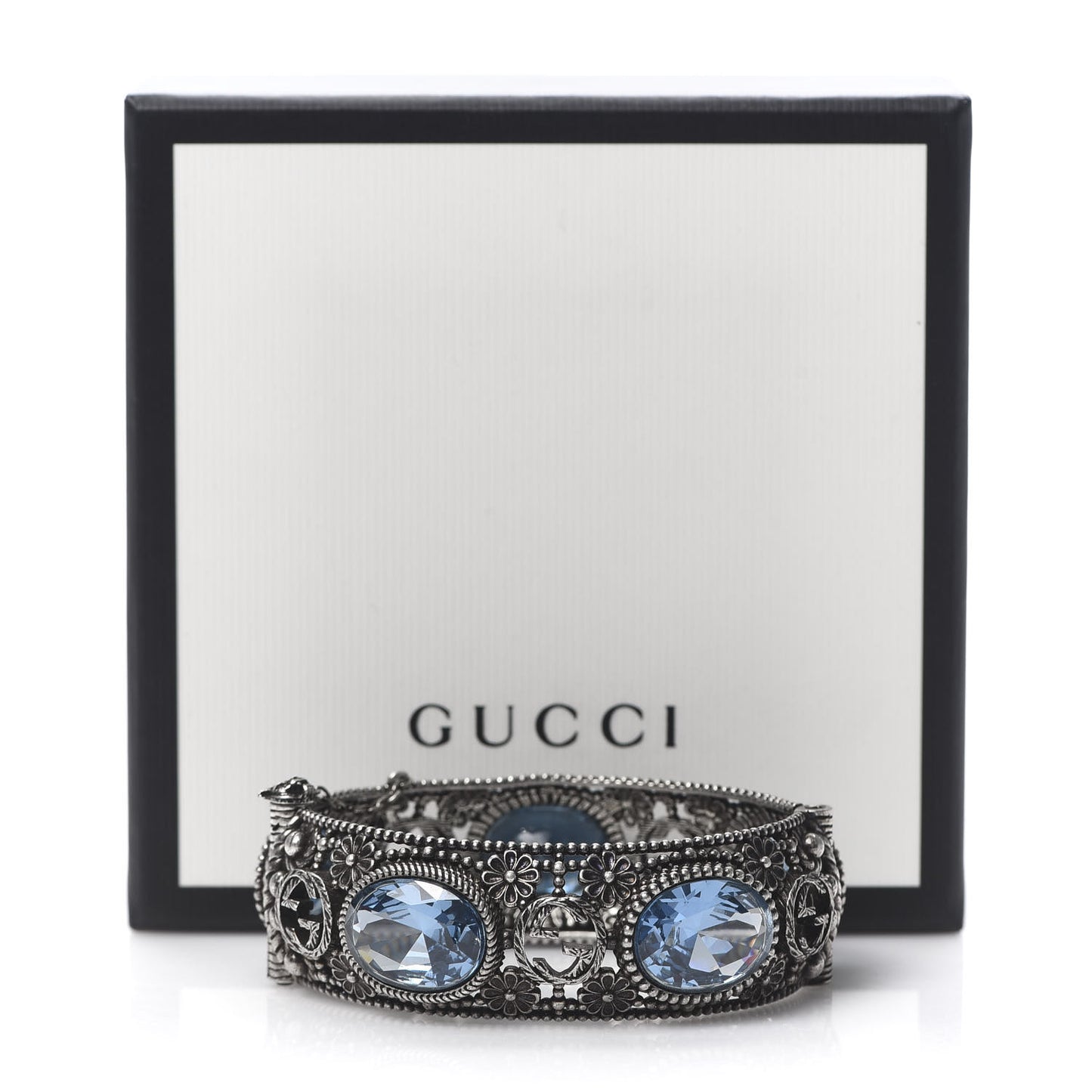 This is an authentic GUCCI Sterling Silver Crystal Interlocking G Bangle Bracelet Blue. The bracelet is crafted of sterling silver and features a hinged band adorned with ornate floral patterns and set with blue crystal stones. This is a stunning bracelet with the whimsical style of Gucci!Follow this item for alerts. Gucci is a registered trademark of Gucci. FASHIONPHILE is not affiliated with Gucci.