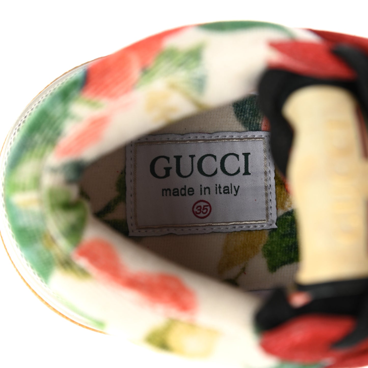 This is an authentic pair of GUCCI Suede Calfskin Womens Ultrapace Mid Top Sneakers 35 Hibiscus in Red, Black, and Neon Yellow Yolk. These stylish sneakers are crafted of red and black fabrics with a floral design at the mouth of the shoe. The shoes feature a velcro strap in the front and black laces. It has black soles with a yellow Gucci logo.Follow this item for alerts. Gucci is a registered trademark of Gucci. FASHIONPHILE is not affiliated with Gucci.