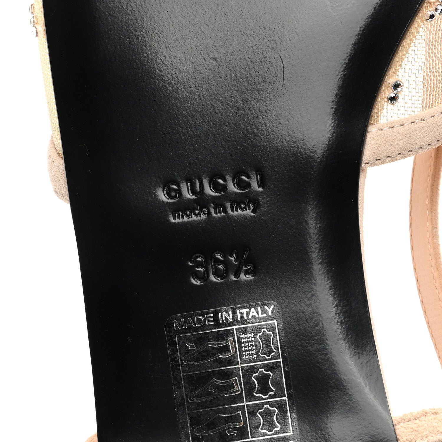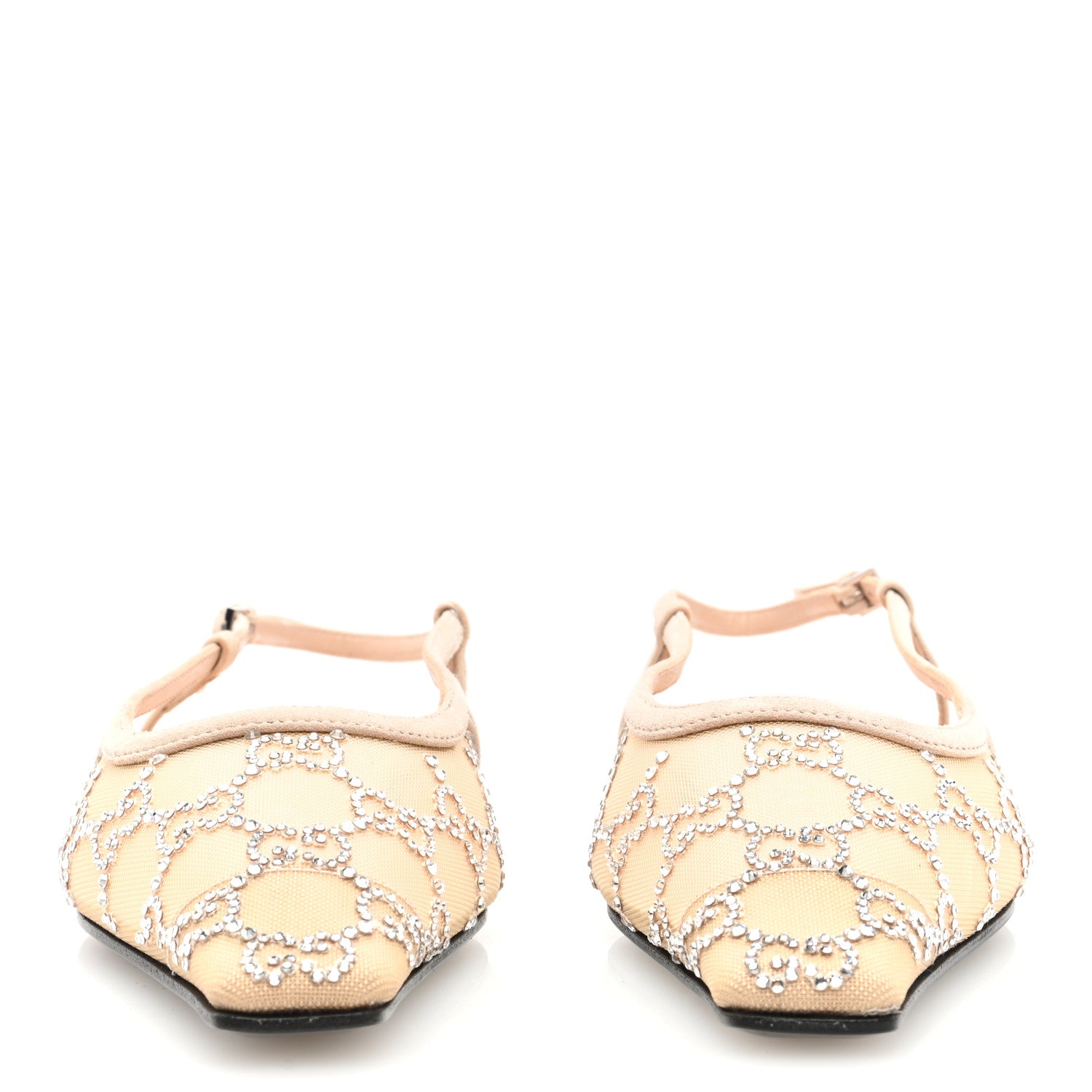 This is an authentic pair of GUCCI Suede Mesh Crystal GG Monogram Slingback Ballet Flats size 36.5 in Light Powder Skin Rose. These pumps are crafted of mesh embellished with crystal GGs throughout. They feature an adjustable pink suede slingback strap, silver hardware, and a 0.75-inch heel.Follow this item for alerts. Gucci is a registered trademark of Gucci. FASHIONPHILE is not affiliated with Gucci.