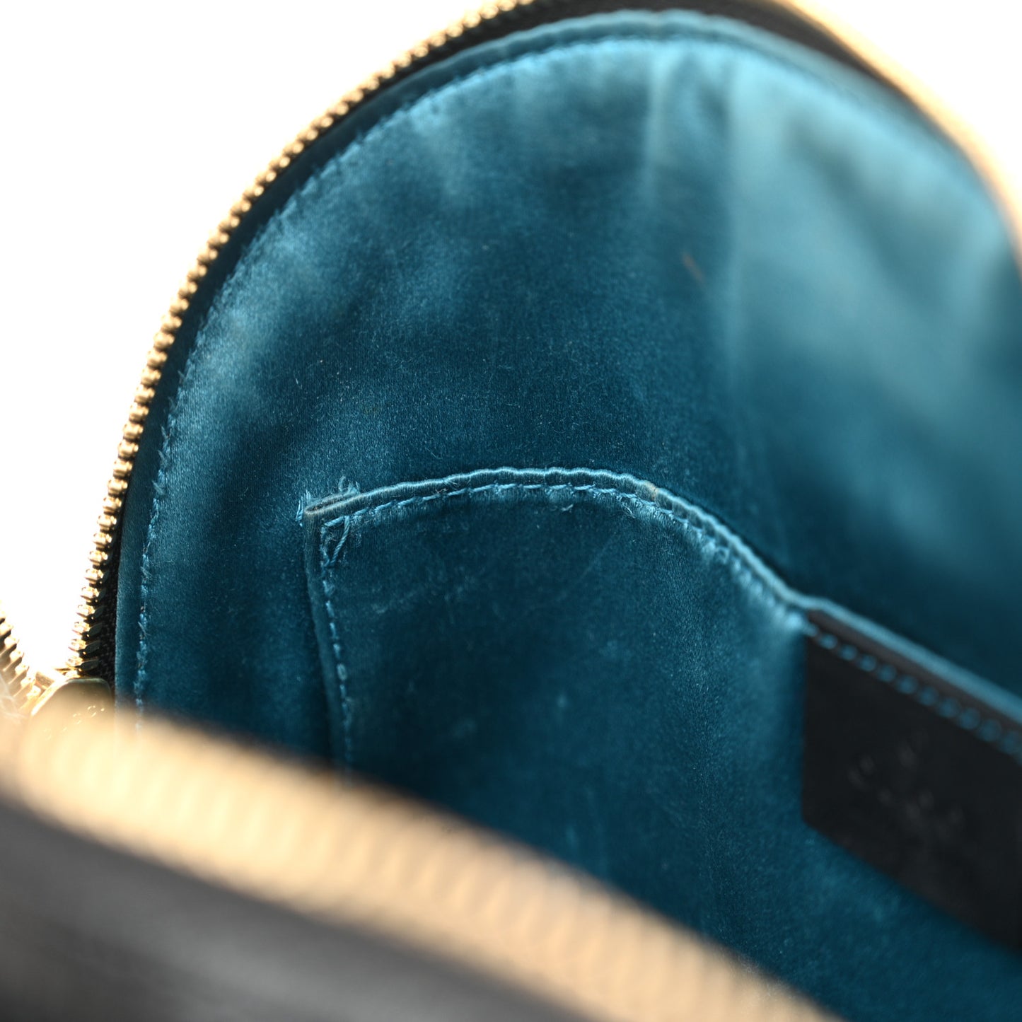 This is the authentic GUCCI Suede Patent Web GG Small Ophidia Dome Shoulder Bag in Black. This crossbody bag is crafted of black suede with patent leather trim. The bag features an adjustable black patent leather shoulder strap and gold hardware. This opens to a bright blue satin fabric interior with patch pockets.Follow this item for alerts. Gucci is a registered trademark of Gucci. FASHIONPHILE is not affiliated with Gucci.