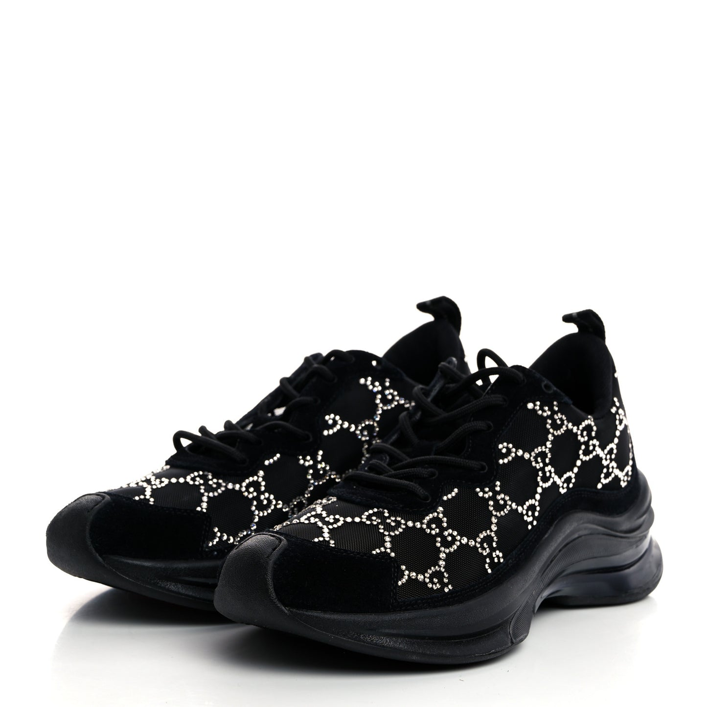 This is an authentic pair of GUCCI Tela Retino Mesh Crystal Suede GG Monogram Womens Gucci Run Sneakers size 36 in Black and Silver. These sneakers feature a crystal GG monogram on black mesh with black suede trim.Follow this item for alerts. Gucci is a registered trademark of Gucci. FASHIONPHILE is not affiliated with Gucci.